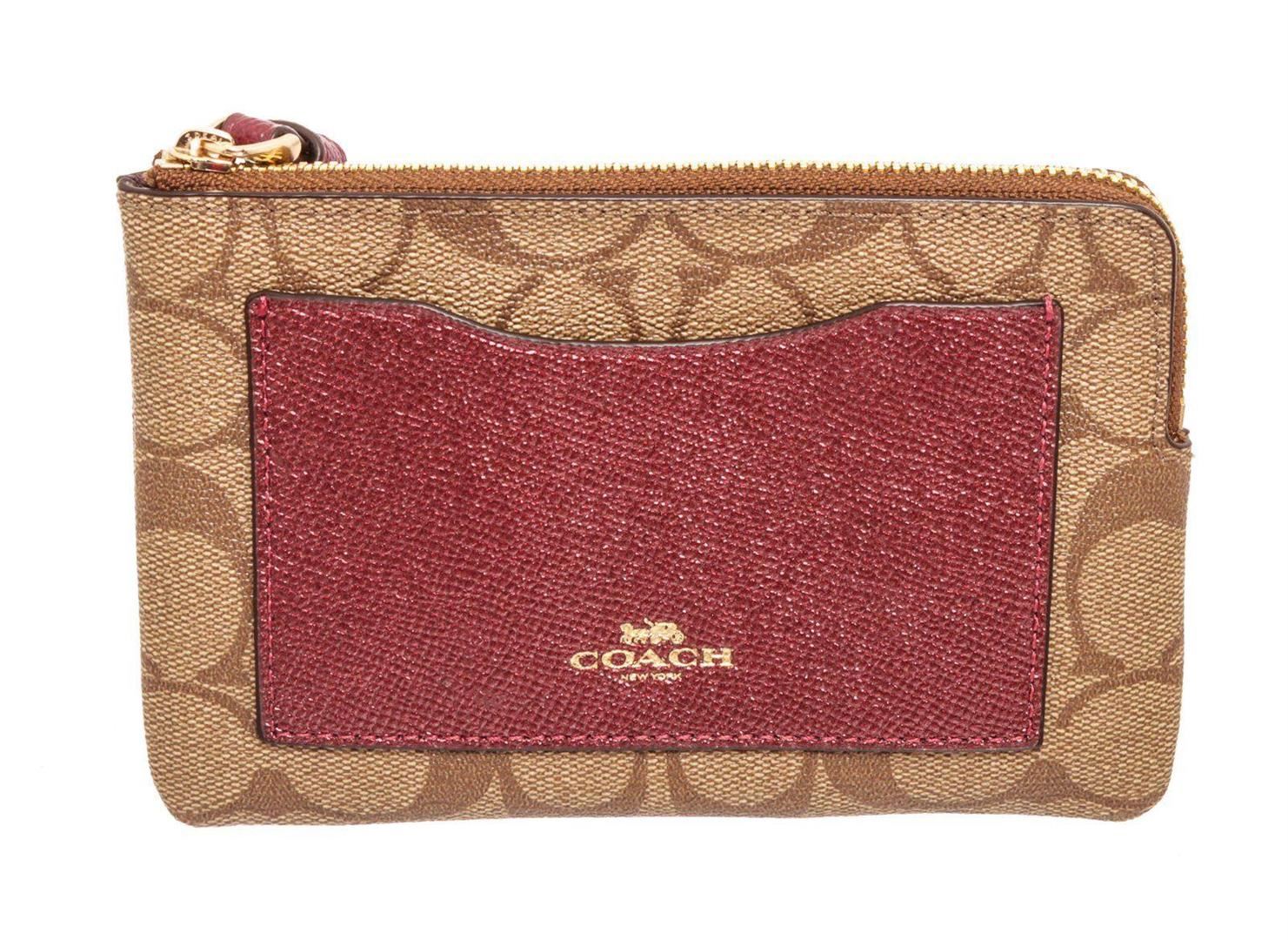 Coach brown & red coated canvas boxed corner wristlet with gold-tone hardware, single flat wristlet strap, single slip pocket at front with embossed logo, brown canvas interior lining, two cardholder slots and overall zip closure. Measurements: Length: 6.4 in / 16 cm Width: 0.5 in / 1 cm 4.35 in / 11 cmCONDITION: Pre-Owned Good overall, please see photographs for detail.