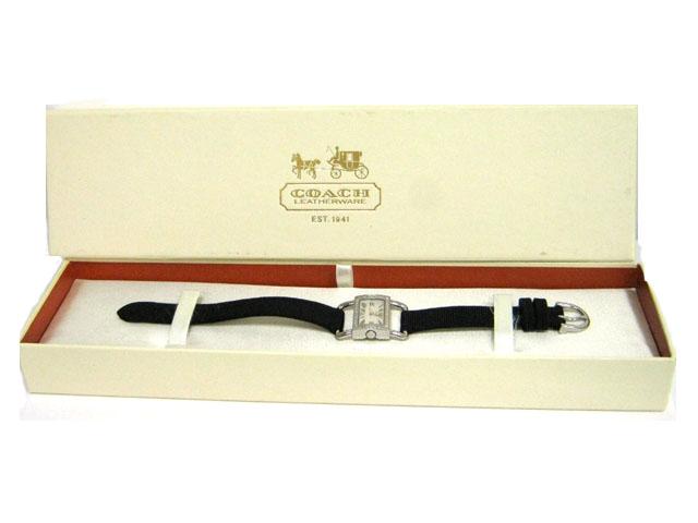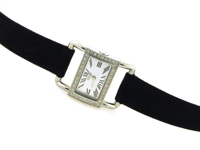 This is a Coach Women's Crystal Bezel Watch with the following features: black strap with Coach name; Crystal on Bezel; White dial; Stainless steel; and Water resistant.
