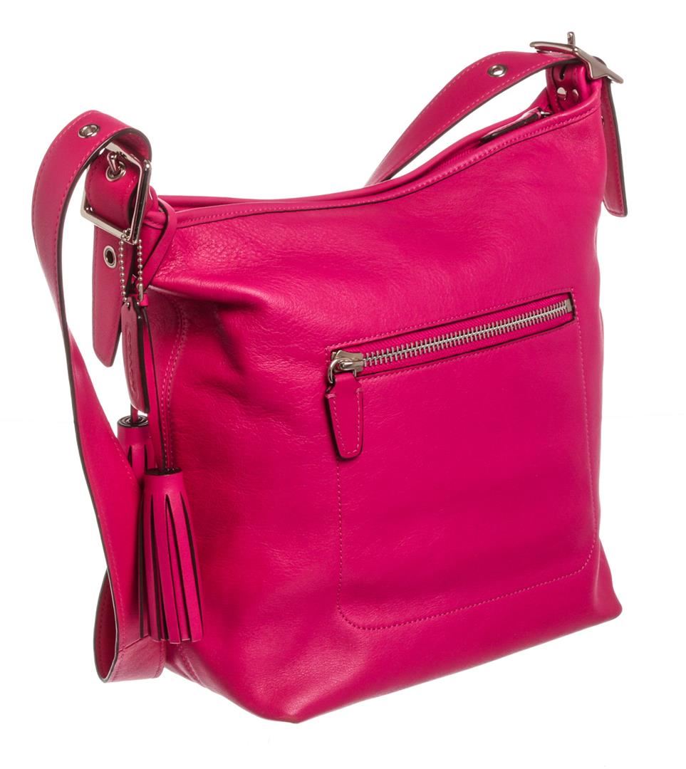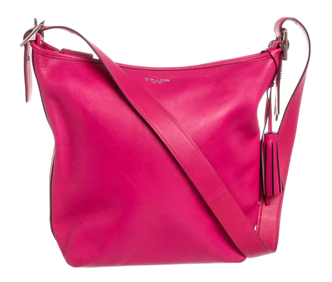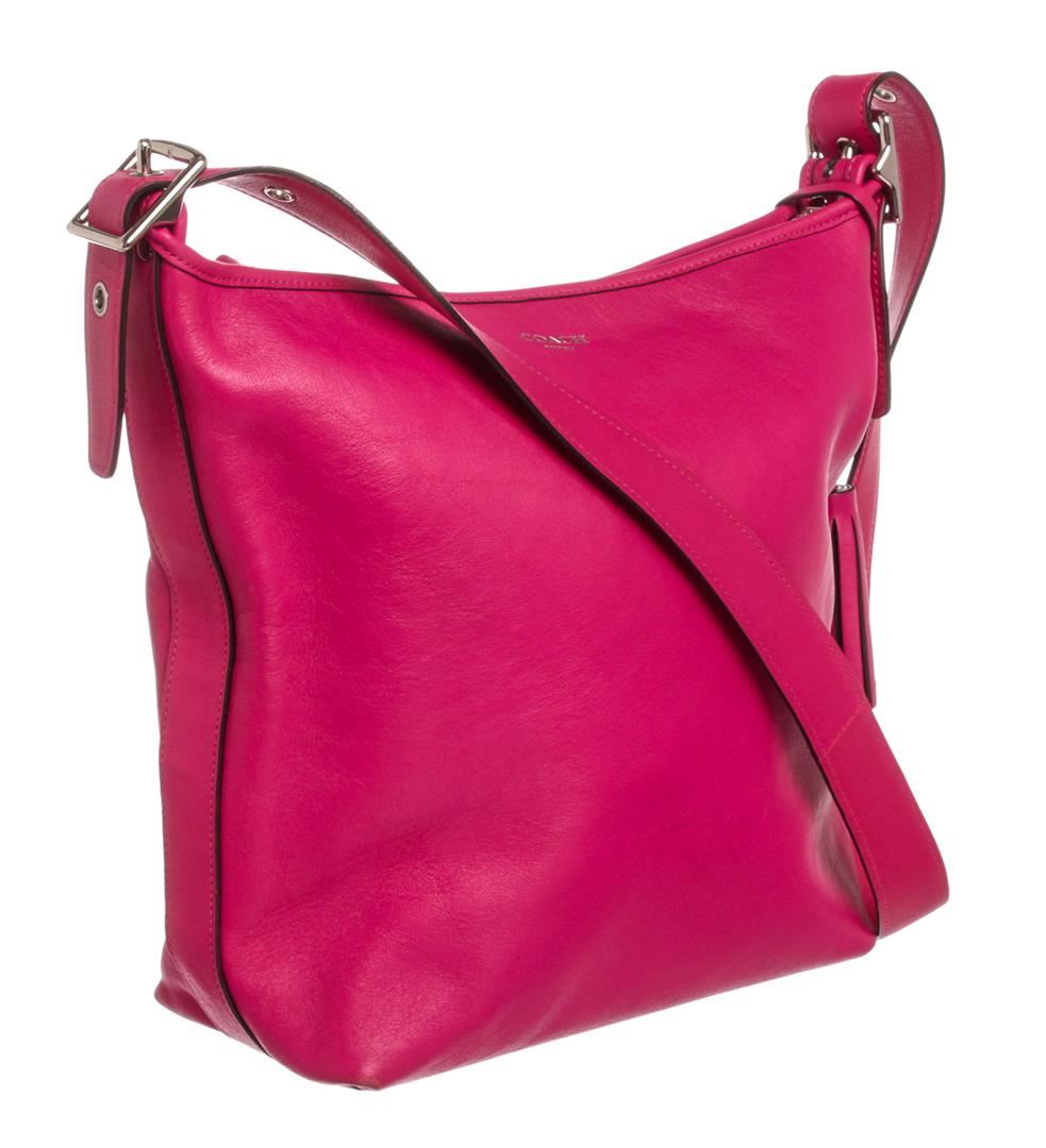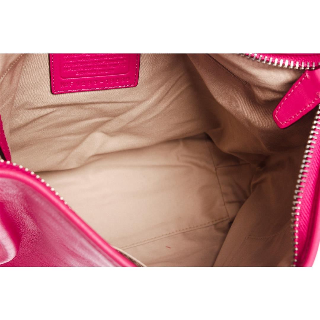 Crafted out of fuchsia pink leather, silver-tone hardware, and zip top closure. Inner tonal fabric lining.