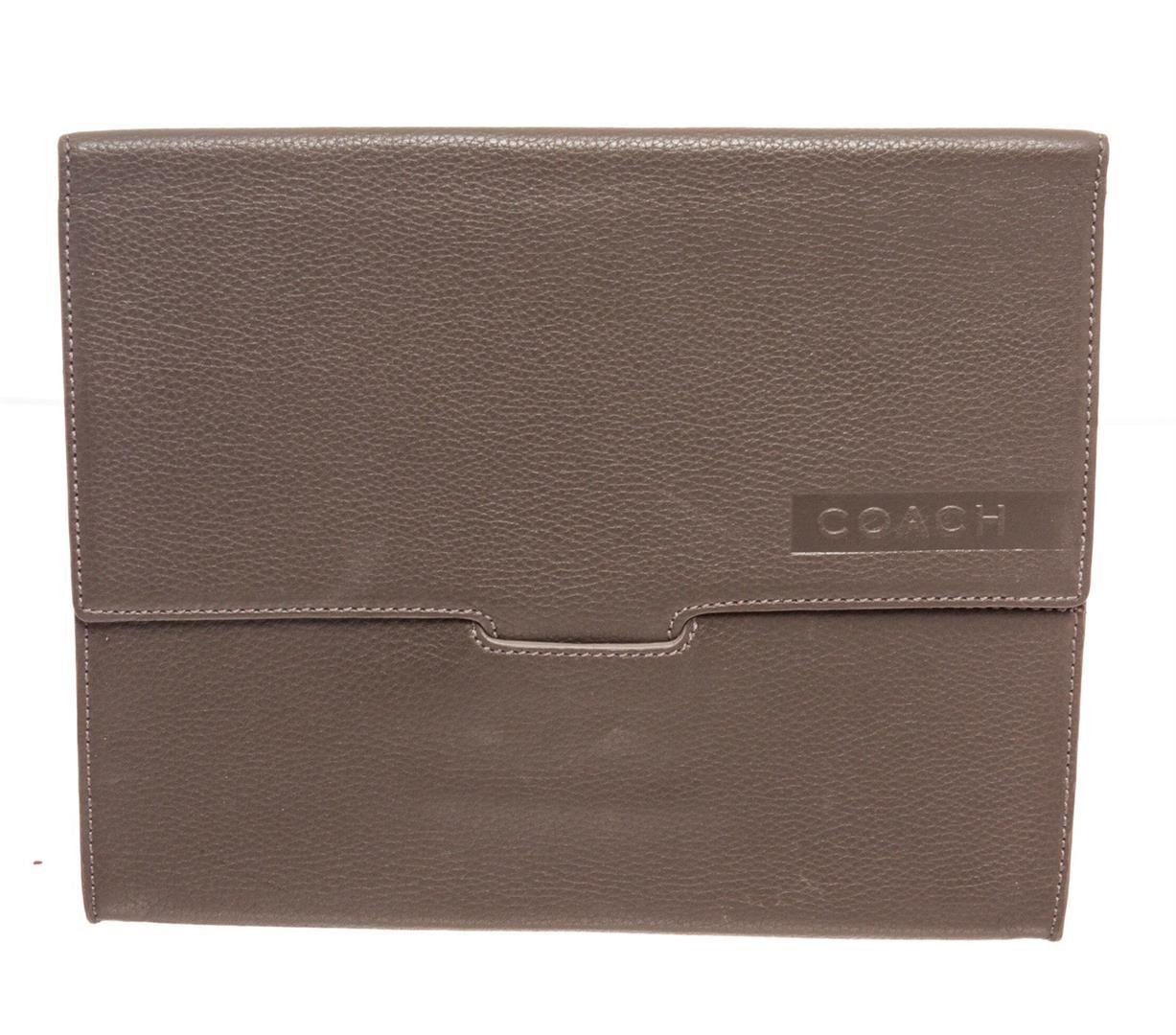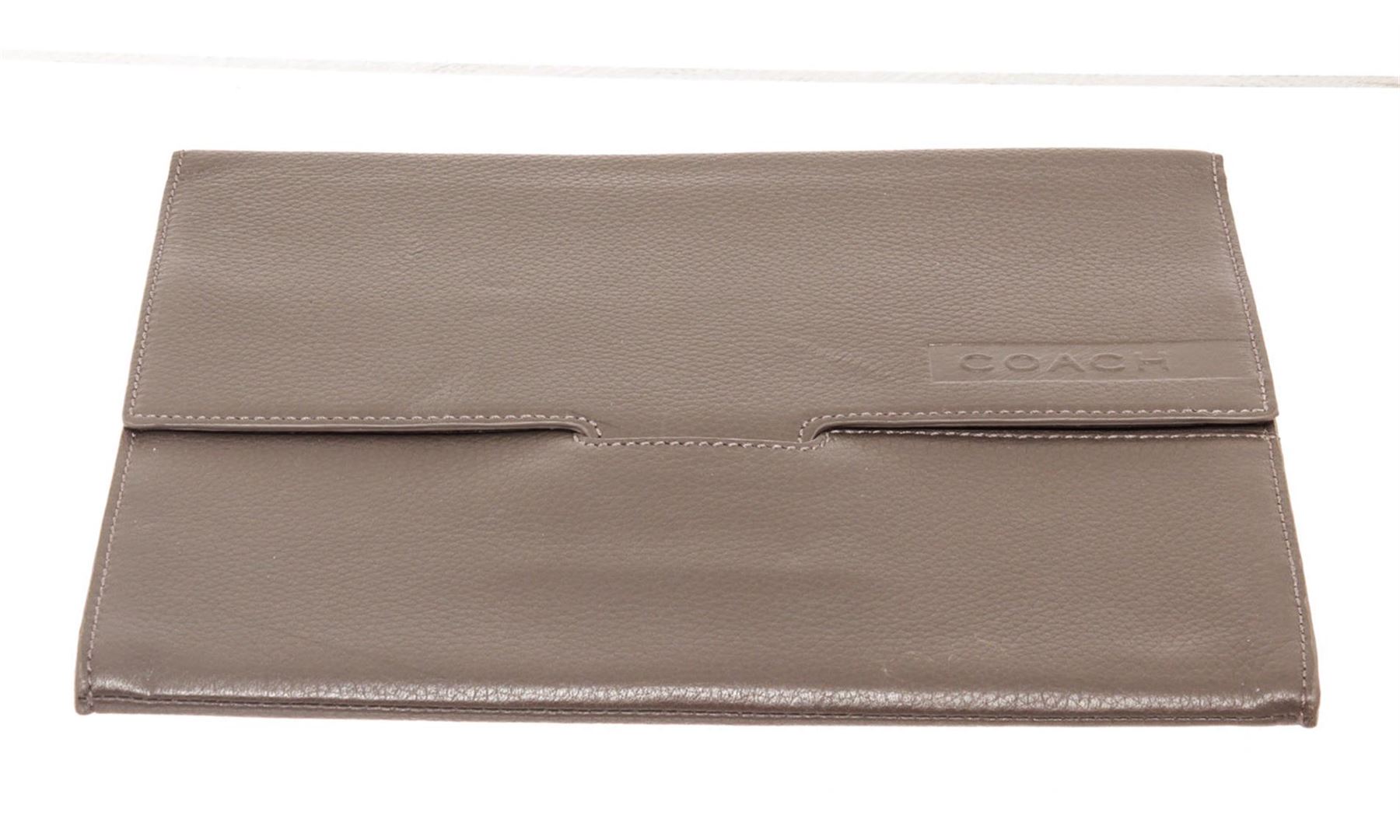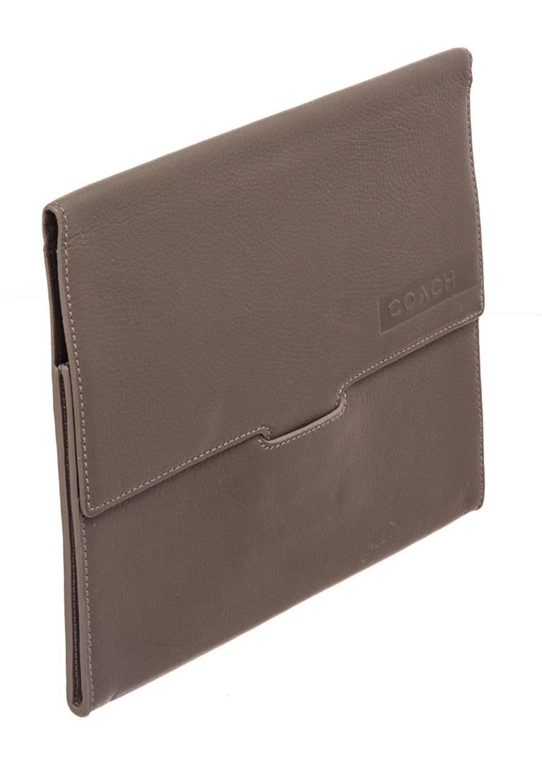 Coach grey pebbled leather tablet sleeve, embossed logo at front, black logo canvas interior lining and overall flap closure.