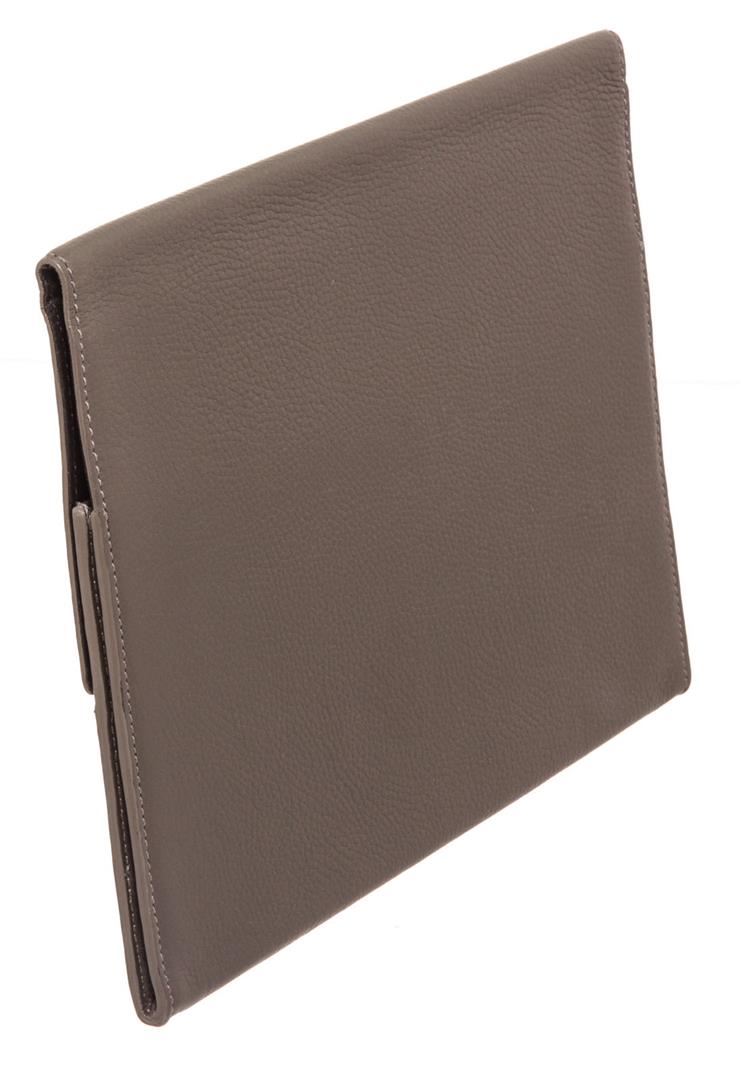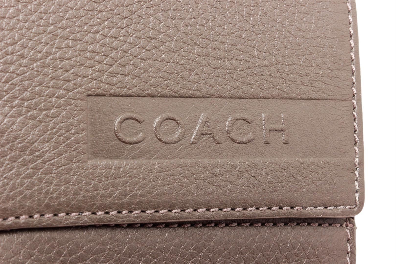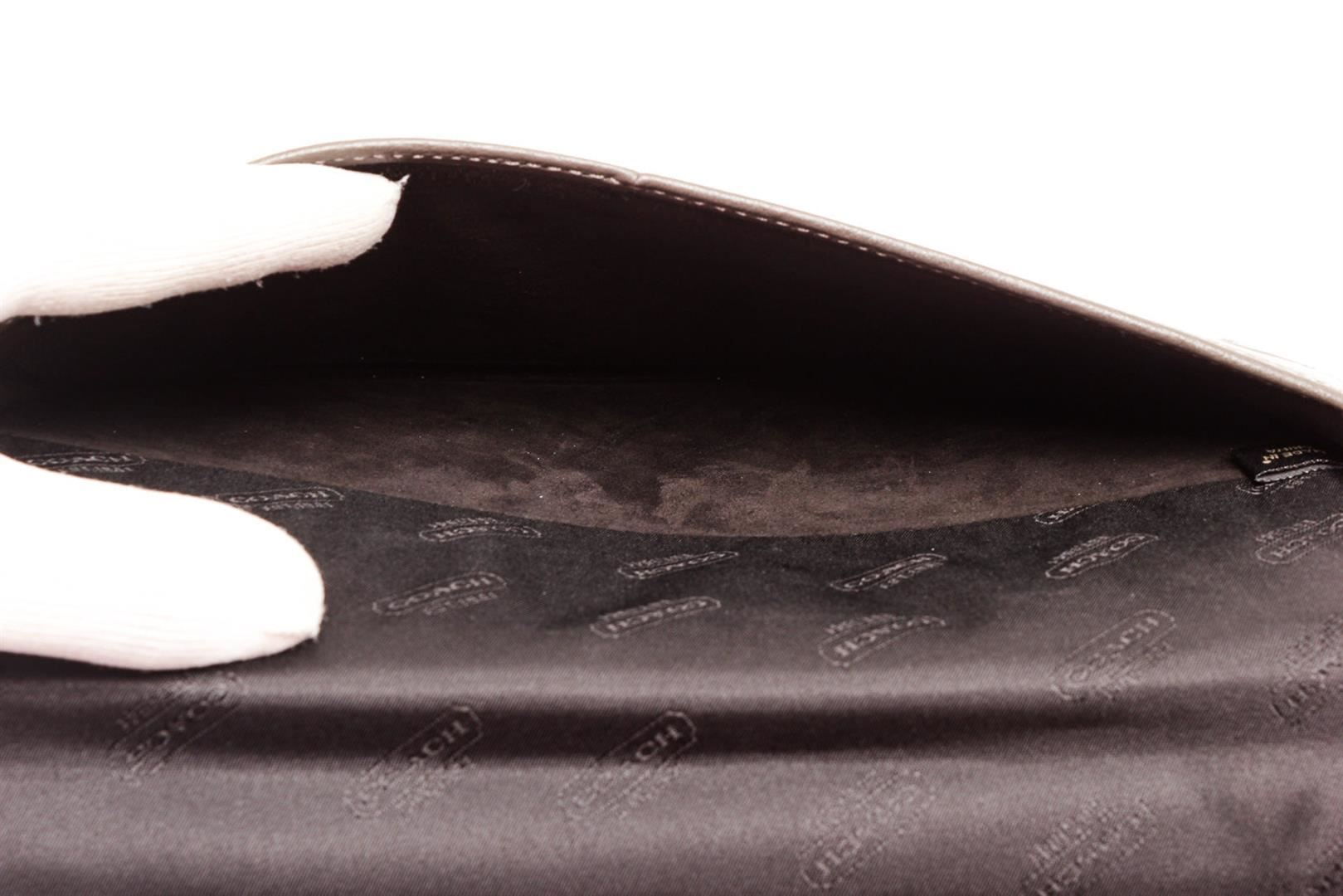 Coach grey pebbled leather tablet sleeve, embossed logo at front, black logo canvas interior lining and overall flap closure.