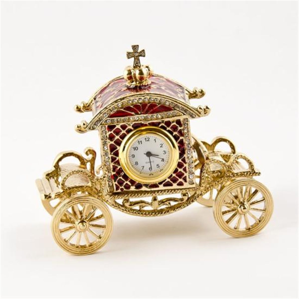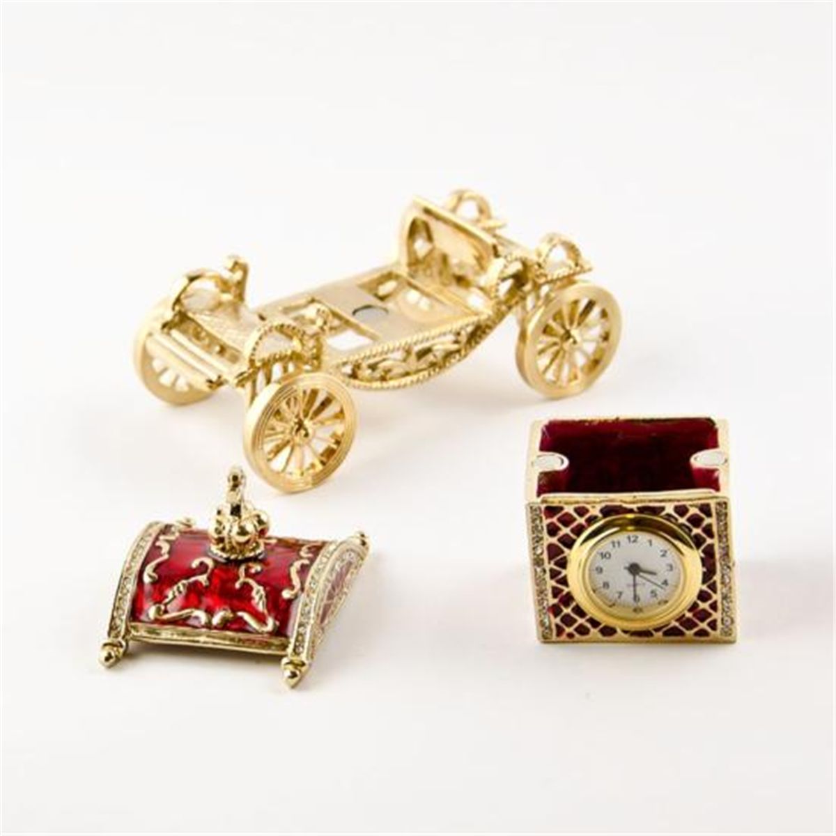 Coach Jewelry Trinket Box. Magnificently crafted using glossy red enamel applied on yellow golden plated metal ornamented in miniature crystals, this coach jewelry box is a true piece of art. The little clock box comes off the golden carriage as well as the rooftop for jewelry to be stored inside the carriage. It is a beautiful miniature jewelry box. Material: Pewter, Crystals, Enamel. Dimensions: 3.25in (L) X 1.75in (W) 3in (H)
