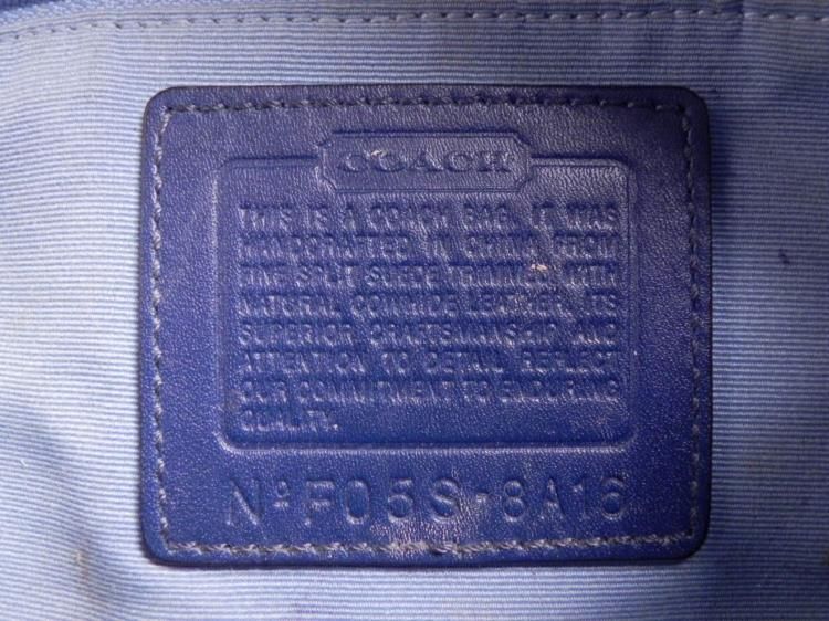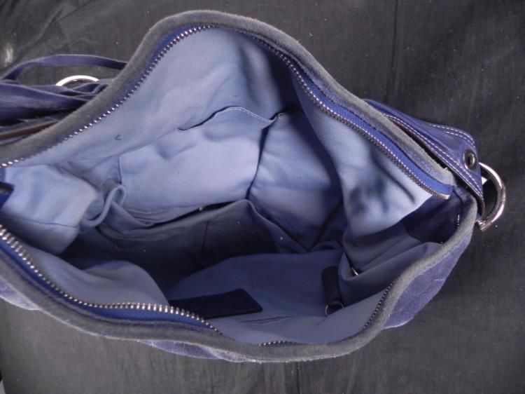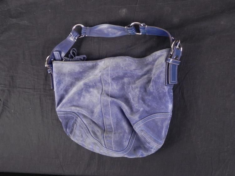This authentic Coach purse is light blue suede, with light blue and white stitching. The handle is leather, with chrome buckles. The interior is light blue canvas, with one main section, two side pockets, and one zippered pocket. The size is 11" x 14" high plus another 17" with the handles. The condition is very good, with normal use scuffs on the suede. * * Just like a pair of blue suede shoes, you'll want everyone to lay off of your blue suede Coach bag.