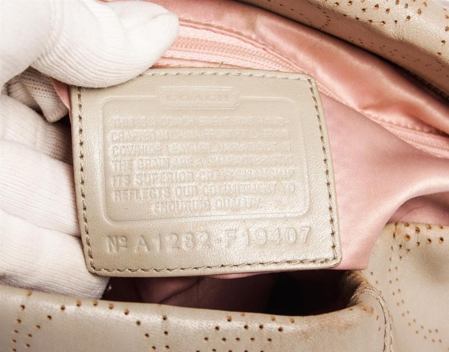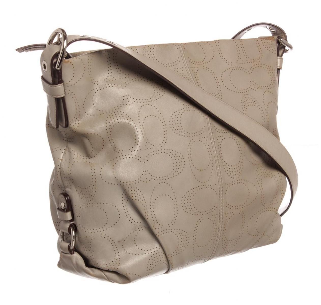 One Coach Light Gray Perforated Monogram Leather Crossbody Handbag. Crafted out of gray perforated monogram leather, silver-tone hardware, and zip top closure. Inner light pink satin lining. MKX