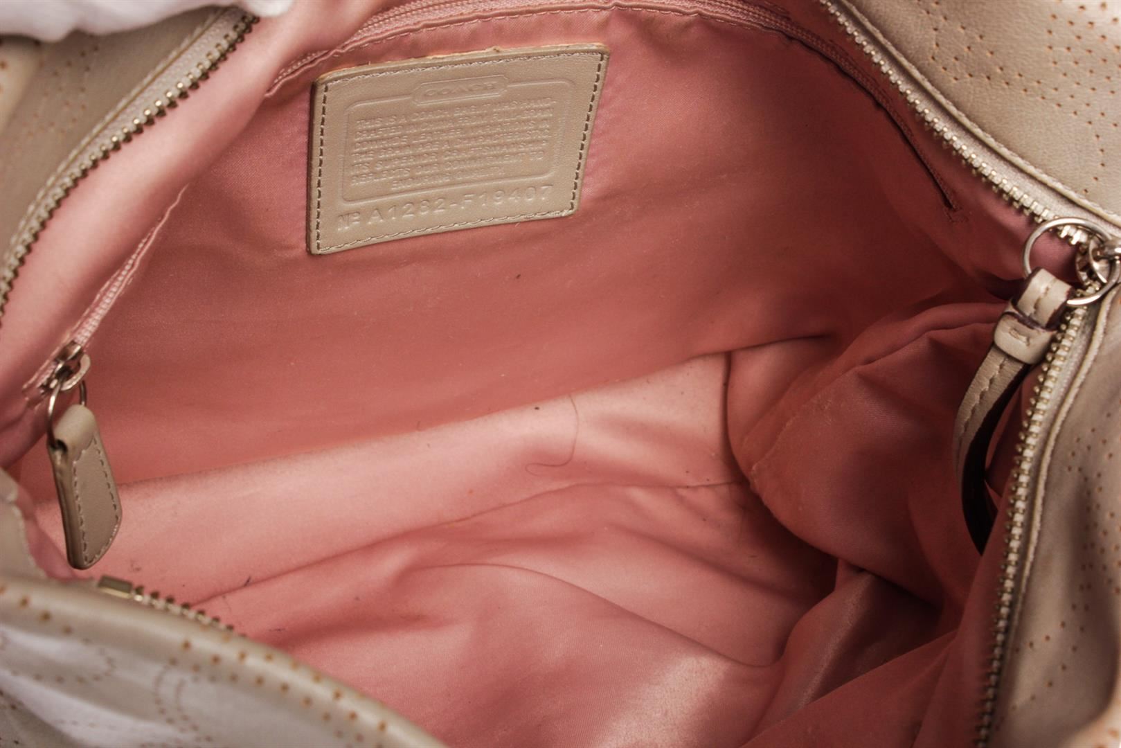 Crafted out of gray perforated monogram leather, silver-tone hardware, and zip top closure. Inner light pink satin lining.