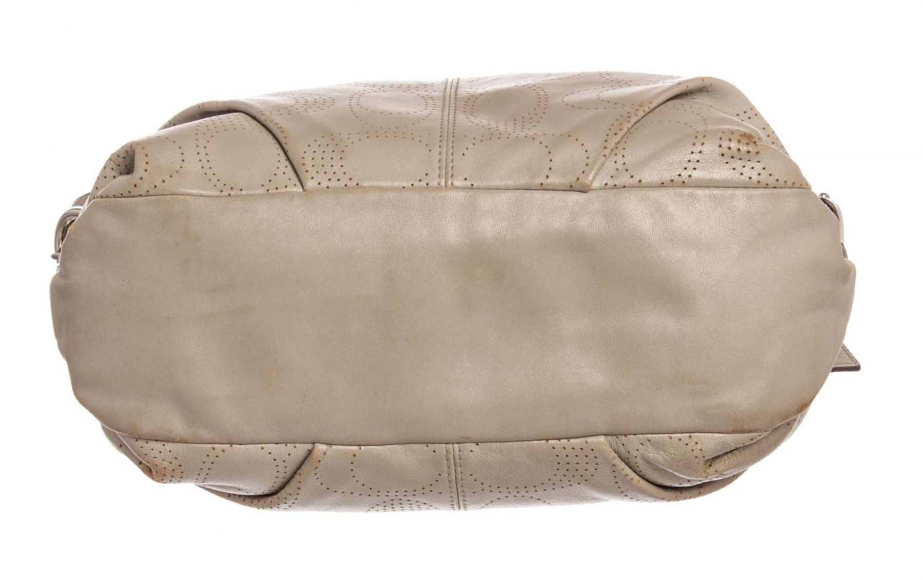 Crafted out of gray perforated monogram leather, silver-tone hardware, and zip top closure. Inner light pink satin lining.