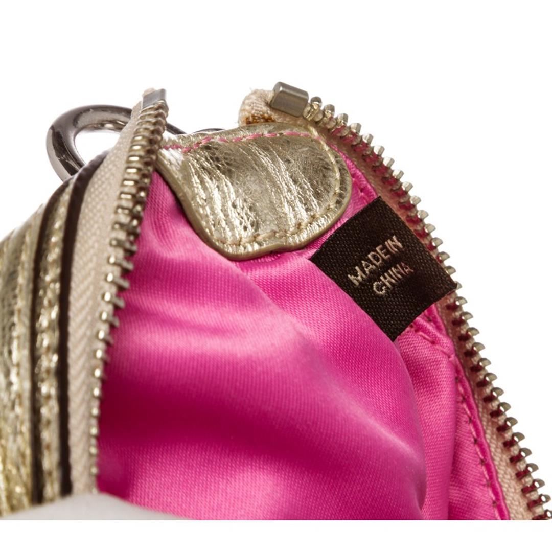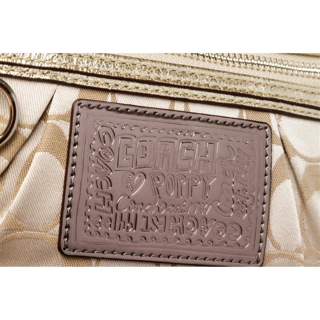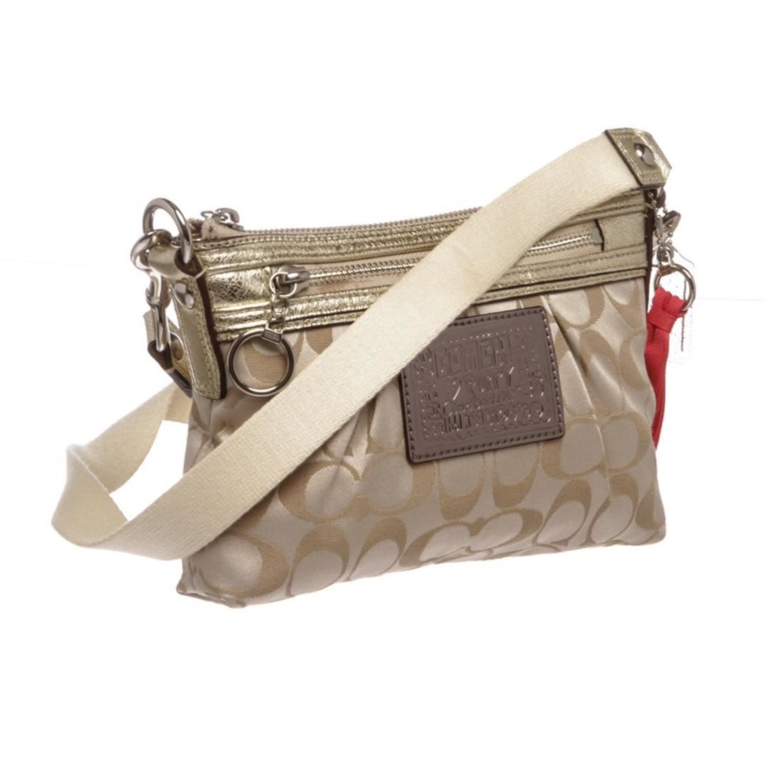 One Coach Metallic Gold Canvas Monogram Poppy Crossbody Bag. Overall zipper closure. Interior is satin lined with oneip pocket. Exterior contains one front zipper pocket, logo plate and adjustable crossbody strap. Item is pre-owned.
