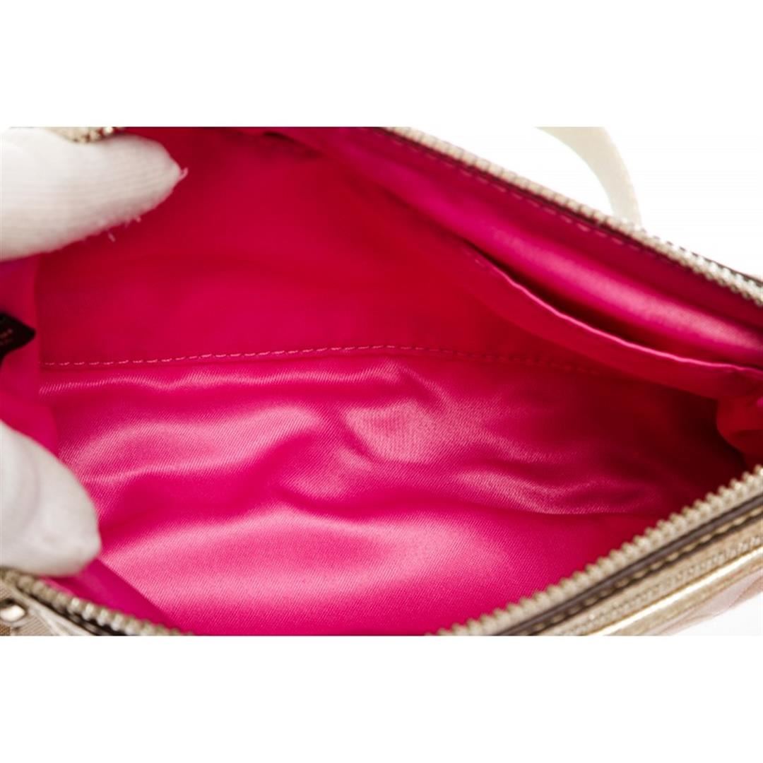 One Coach Metallic Gold Canvas Monogram Poppy Crossbody Bag. Overall zipper closure. Interior is satin lined with oneip pocket. Exterior contains one front zipper pocket, logo plate and adjustable crossbody strap. Item is pre-owned.