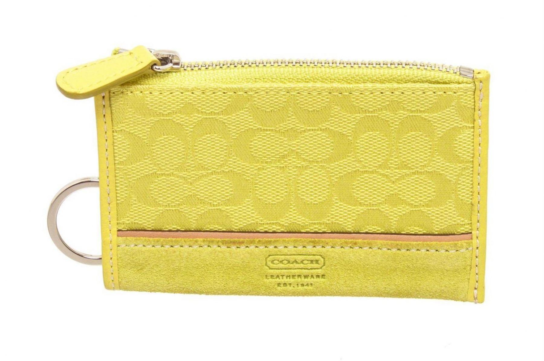 Coach neon yellow canvas small cardholder wallet with silver-tone hardware, embossed logo at front face, single slip pocket at back, neon green canvas interior lining, key chain holder attached inside and overall zip closure at top. Measurements: Length: 4.4 in / 11 cm Width: 0.5 in / 1 cm 3 in / 8 cmCONDITION: Pre-Owned Good overall, please see photographs for detail.