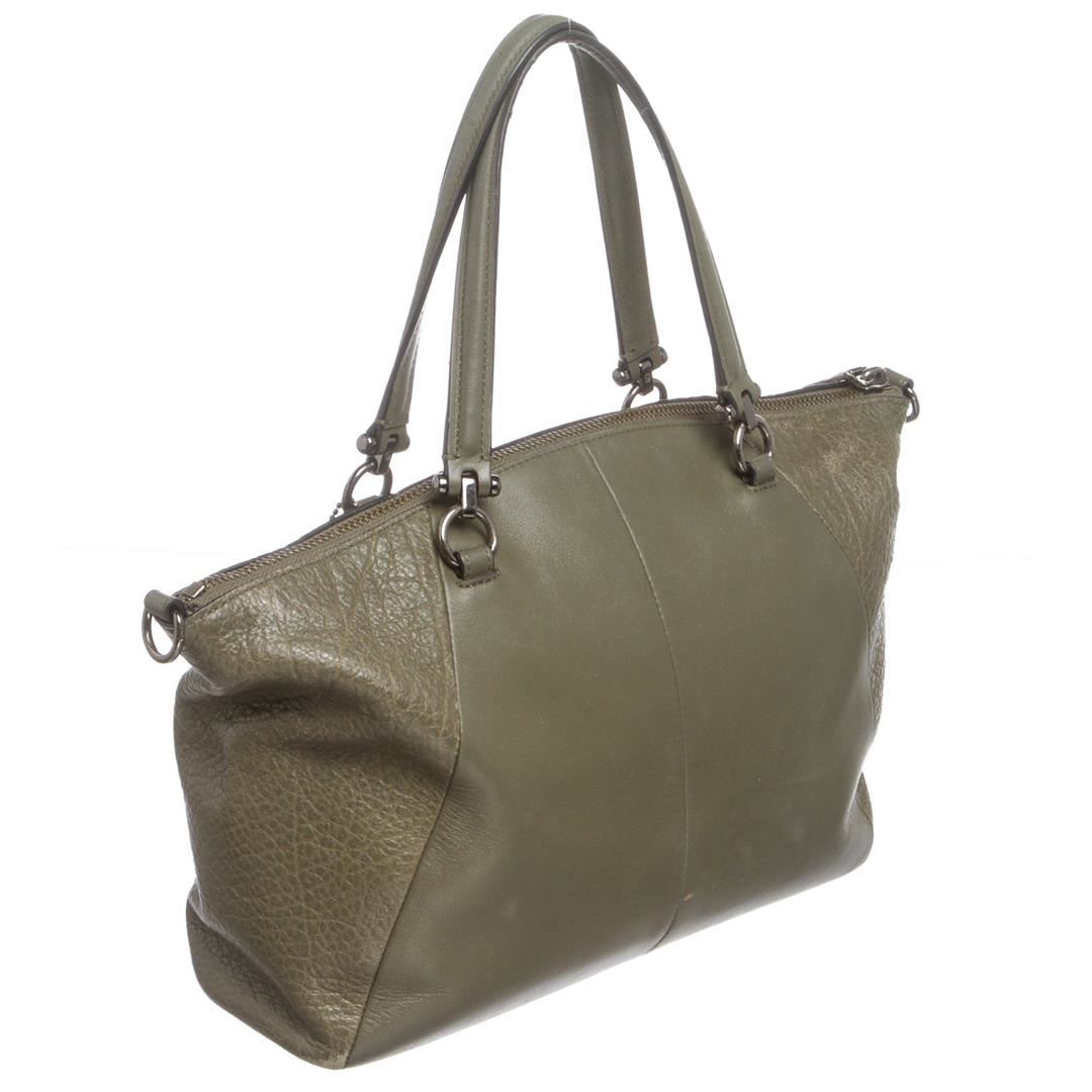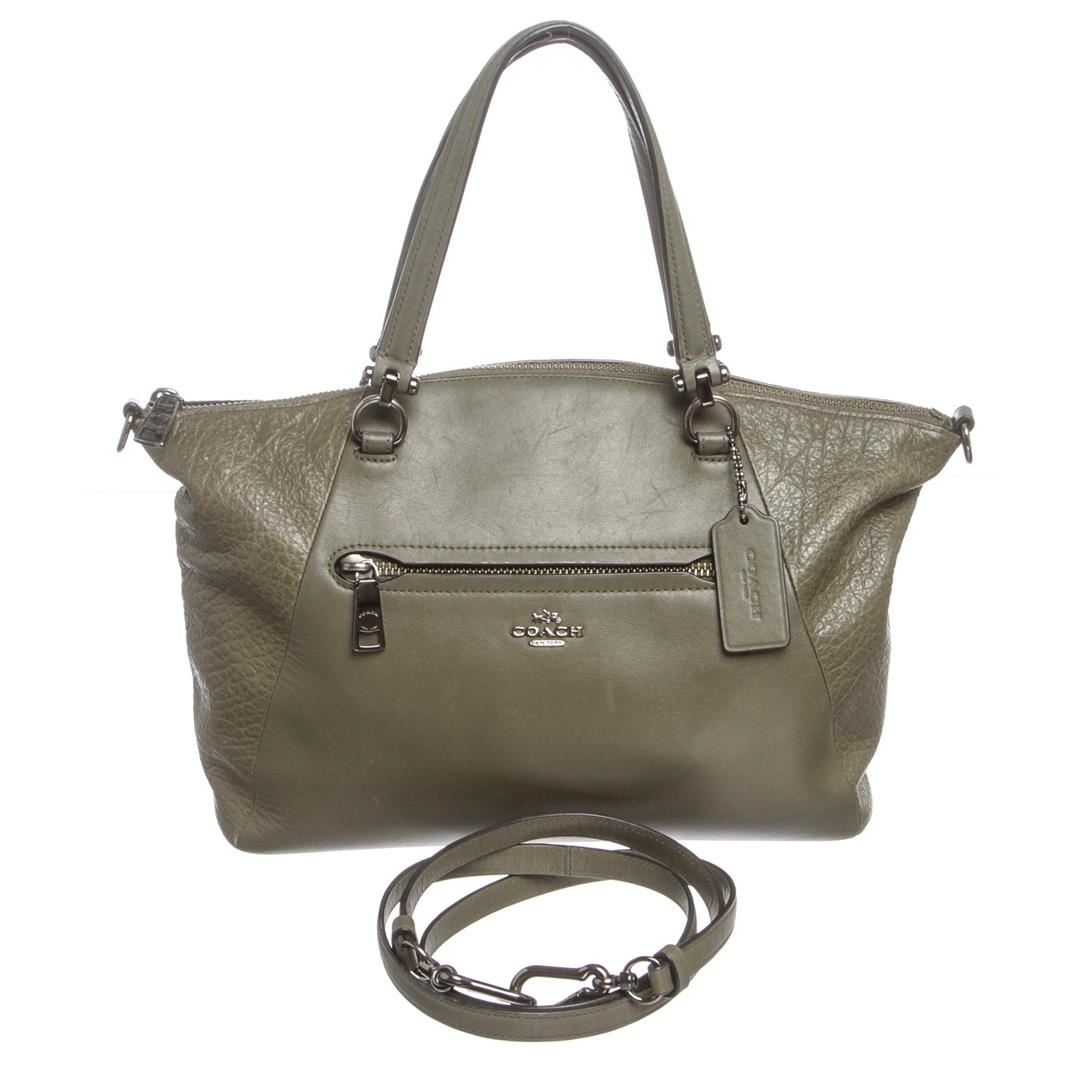 Coach olive green leather handbag with gunmetal hardware, fabric lining, interior zipper pocket on back wall, front exterior zipper pocket, dual flat handles, optional leather shoulder strap, and zip top closure.