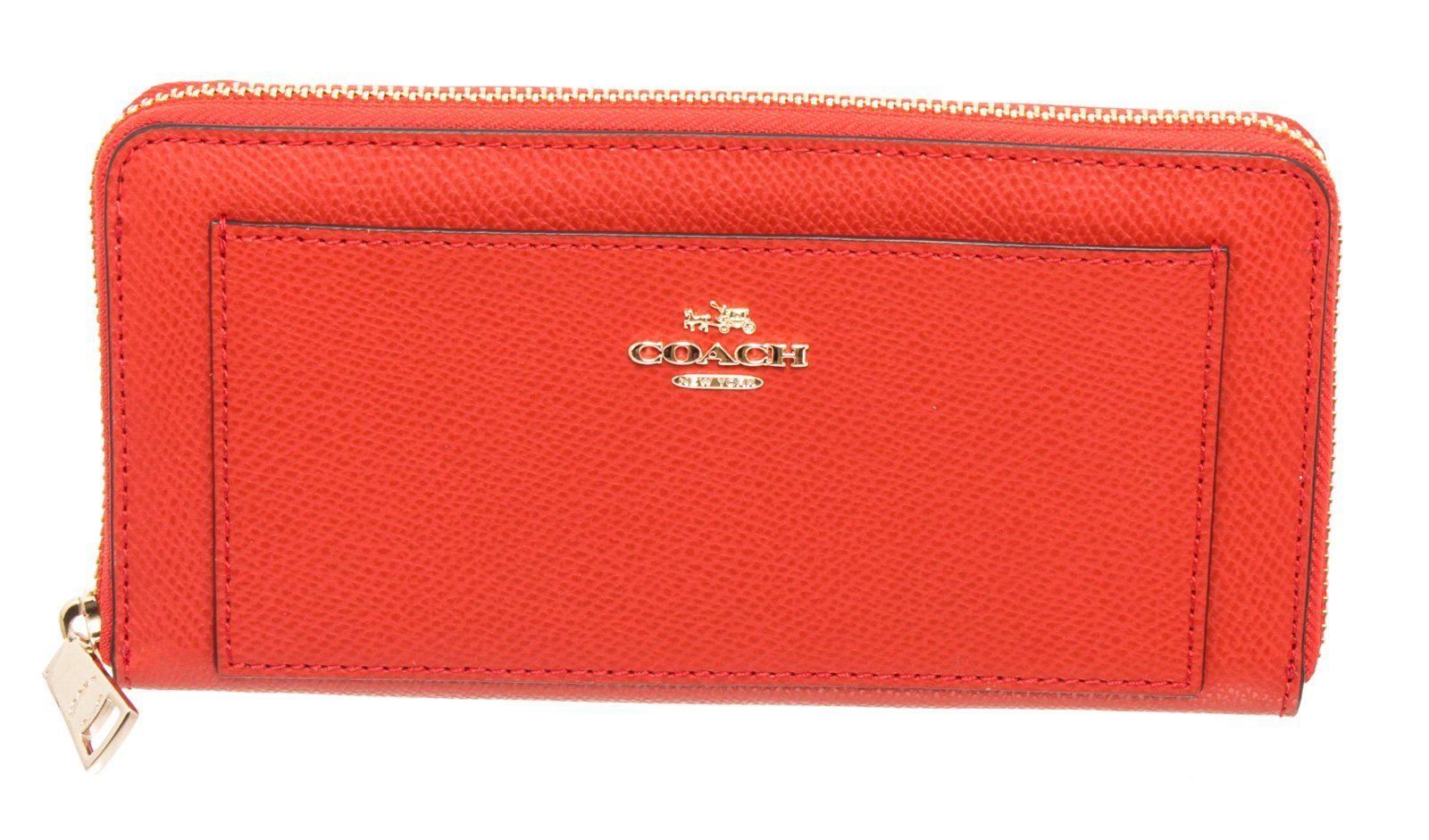 Coach orange leather zippy wallet with gold-tone hardware, logo placard and slip pocket at front, six interior compartments; one with zip closure, twelve cardholder slots and overall zip around closure.         Measurements:  Length: 8.3 in / 21 cm  Width: 0.85 in / 2 cm  4.3 in / 11 cmCONDITION: Pre-Owned Good overall, please see photographs for detail.