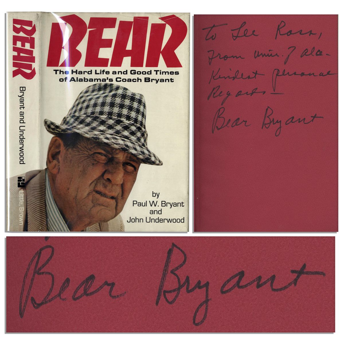 College football Hall of Fame coach Paul W. ''Bear'' Bryant signed fourth printing of his memoir, ''Bear: The Hard Life and Good Times of Alabama's Coach Bryant.'' Published by Little Brown and Company in association with Sports Illustrated Magazine: Boston: 1974. Bear signs, ''To Lee Ross from univ. of Ala- Kindest personal regards - Bear Bryant'' on the front free endpaper. Bryant amassed six national championships as Alabama's head coach. 5.75'' x 8.5'' volume runs 342pp. Light wear to dustjacket, otherwise in unread condition.