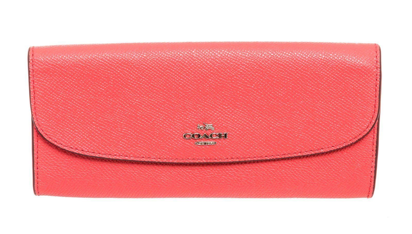 Coach pink crossgrain leather soft wallet with gold-tone hardware, logo placard at front, single zip pocket at back, pink leather interior lining, two interior compartments, eight cardholder slots and overall snap closure at front. Measurements: Length: 7.75 in / 20 cm Width: 0.6 in / 2 cm 3.85 in / 10 cmCONDITION: Pre-Owned Good overall, please see photographs for detail.
