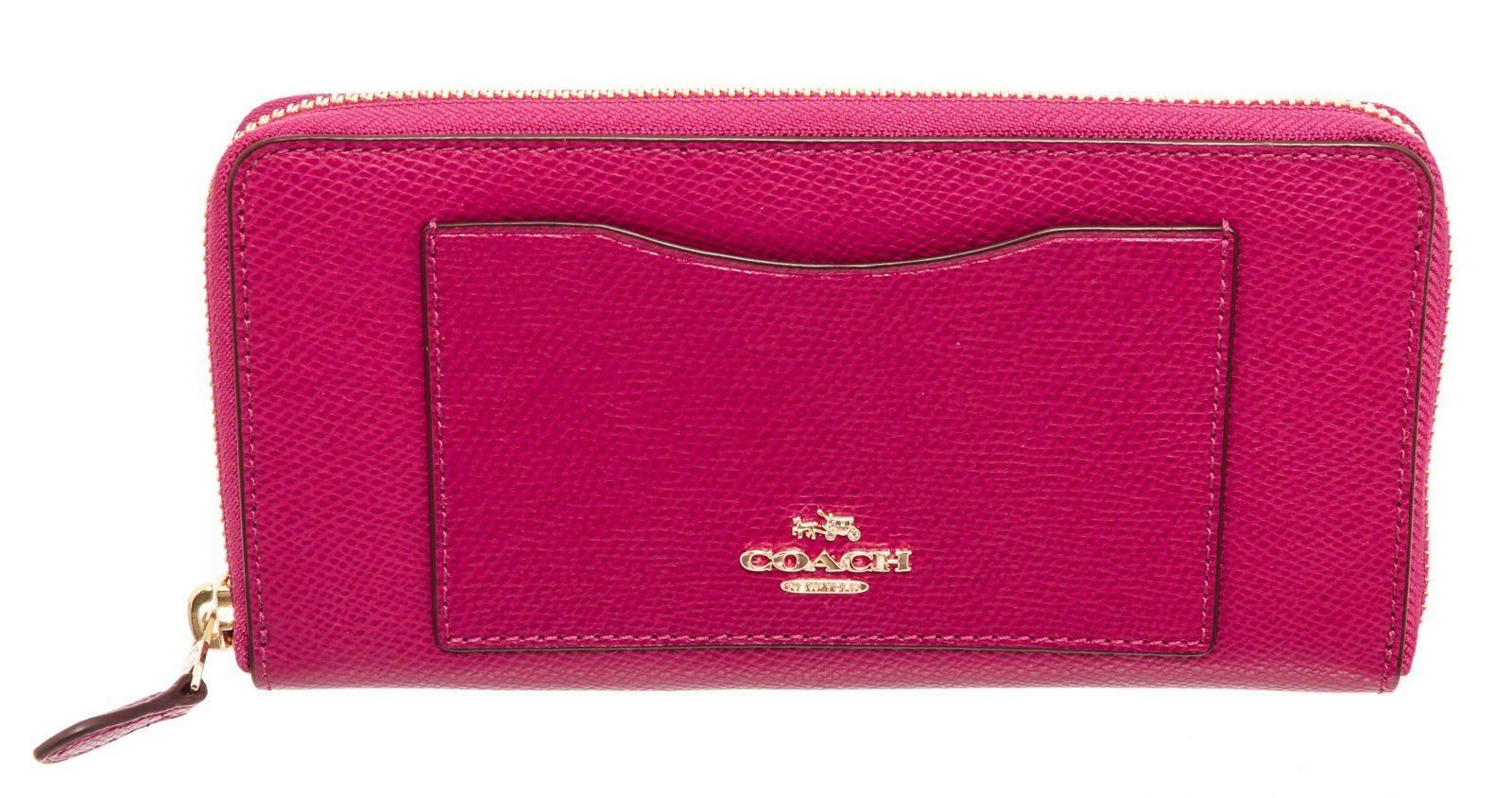 Coach pink leather long zippy wallet with gold-tone hardware, logo placard at front, single slip pocket at front face, five interior compartments; one with zip closure, twelve cardholder slots and overall zip around closure. Measurements: Length: 8.25 in / 21 cm Width: 1 in / 3 cm 4.3 in / 11 cmCONDITION: Pre-Owned Good overall, please see photographs for detail.