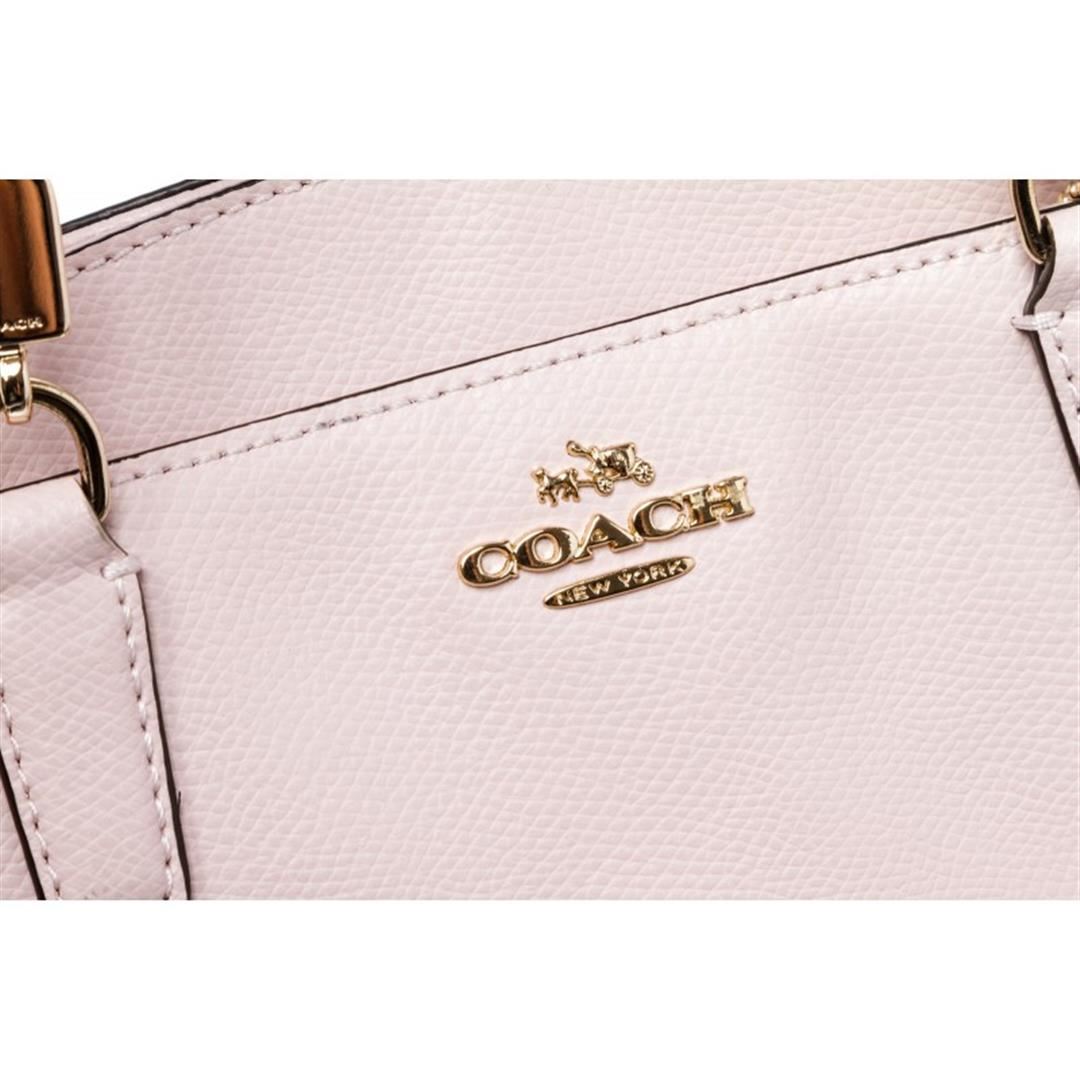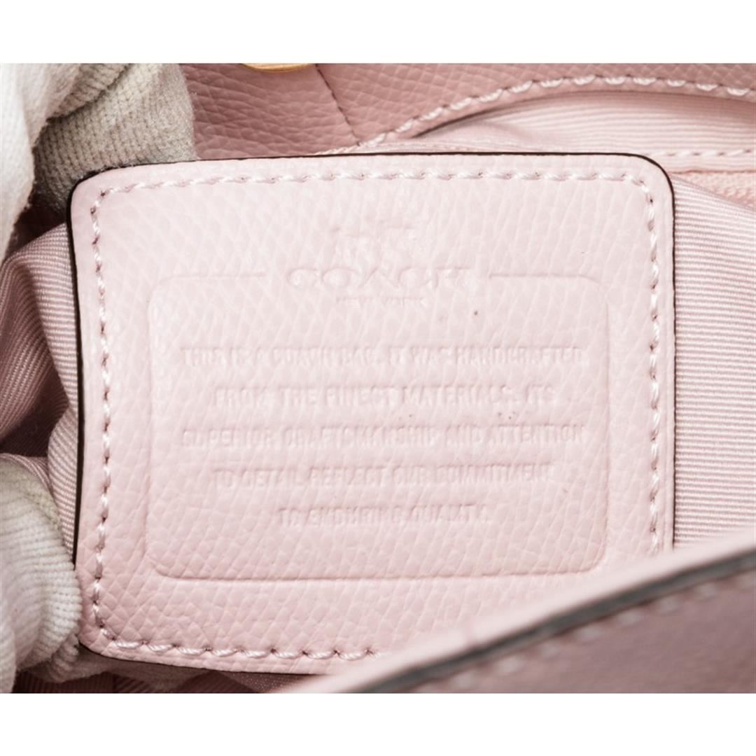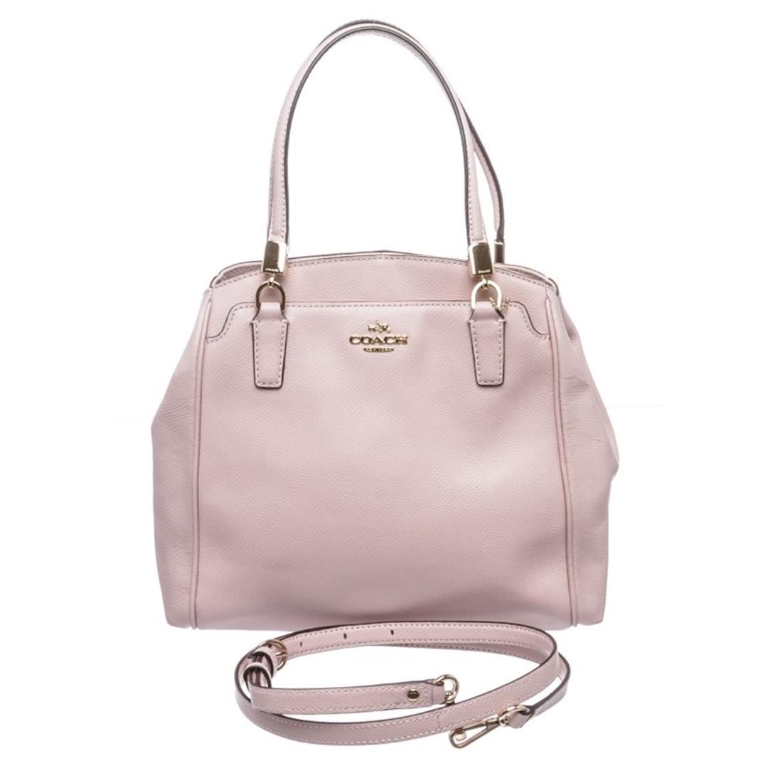 Light pink leather Coach satchel with gold-tone hardware, dual top handles, optional flat shoulder removable strap,ip pocket at rear. Two compartments at interior with zipper pocket partition. Interior contains fabric lining, two pockets at interior walls