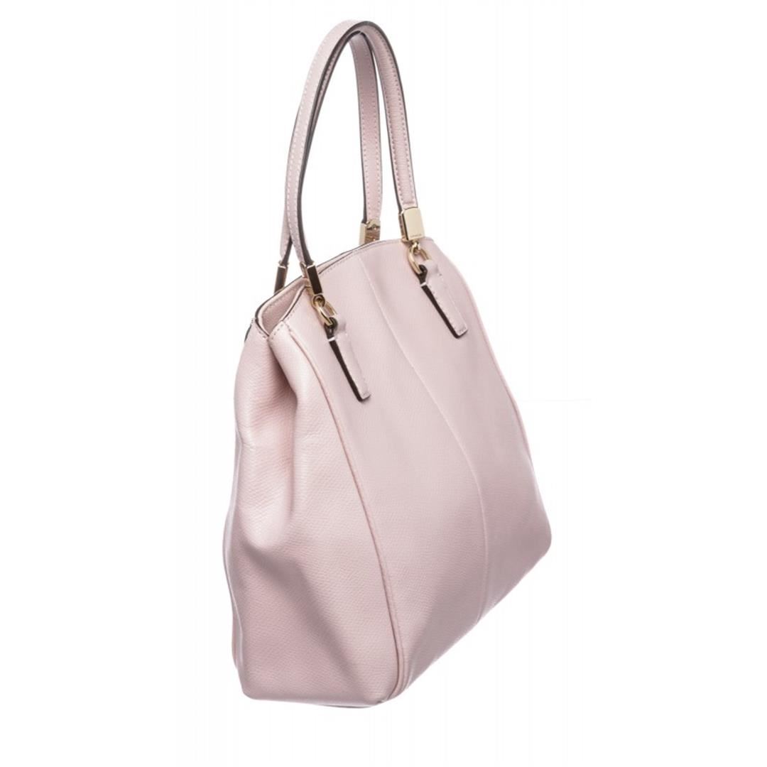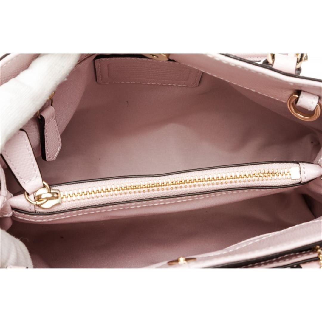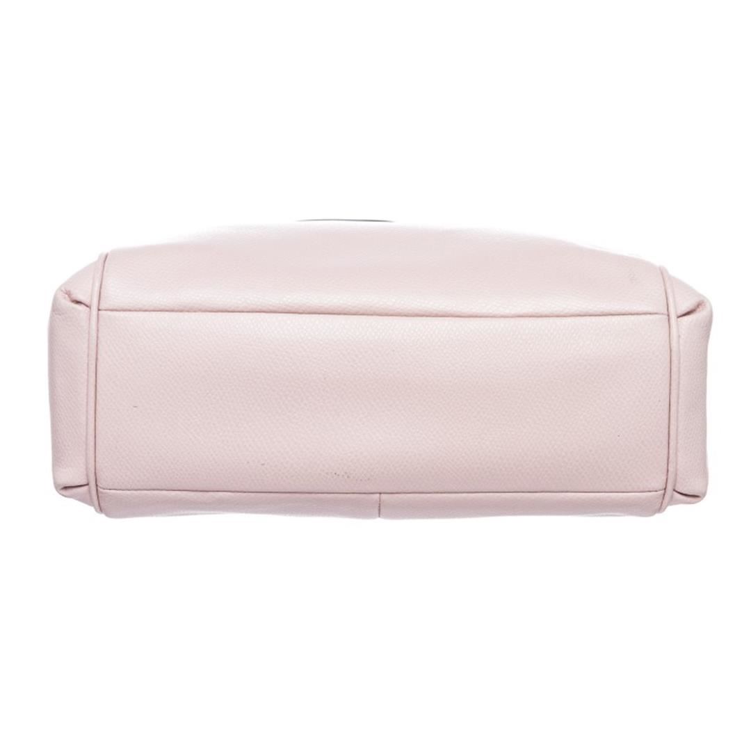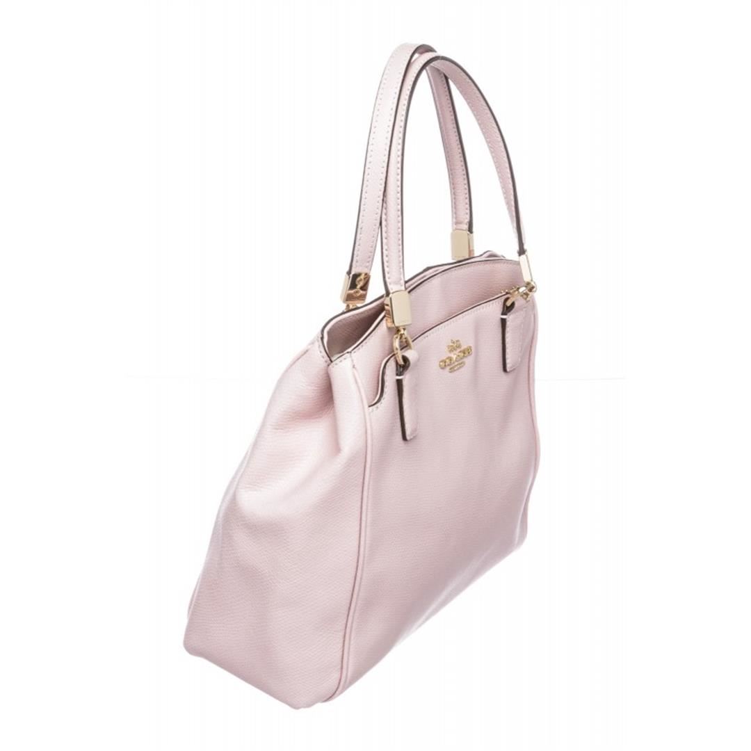 Light pink leather Coach satchel with gold-tone hardware, dual top handles, optional flat shoulder removable strap,ip pocket at rear. Two compartments at interior with zipper pocket partition. Interior contains fabric lining, two pockets at interior walls