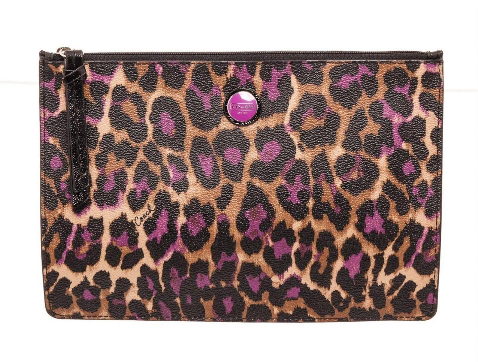 Coach purple ocelot leather zippy pouch with silver-tone hardware, logo placard at front face, black canvas interior lining, one interior slip pocket and overall zip closure at top. Measurements: Length: 9.4 in / 24 cm Width: 0.15 in / 0 cm 6.65 in / 17 cmCONDITION: Pre-Owned Good overall, please see photographs for detail.