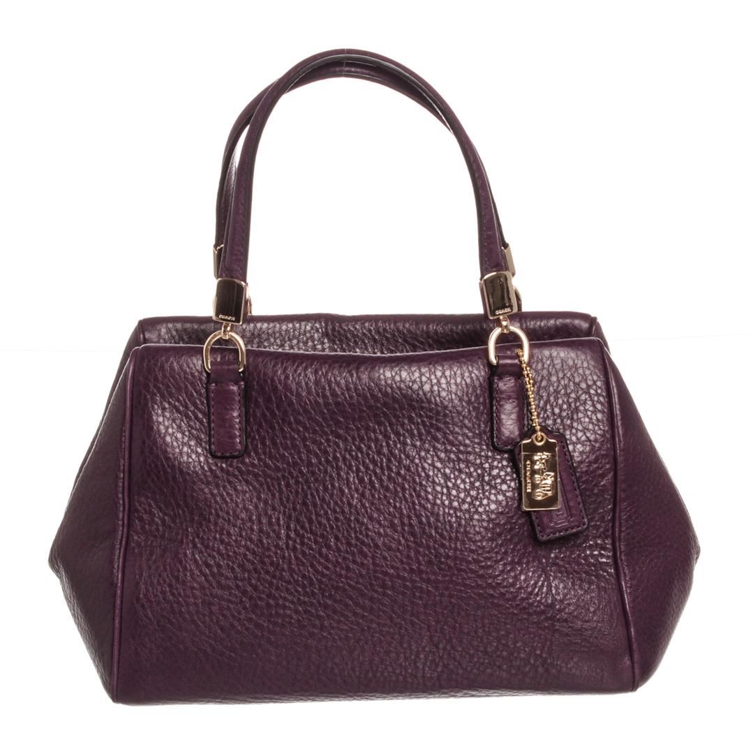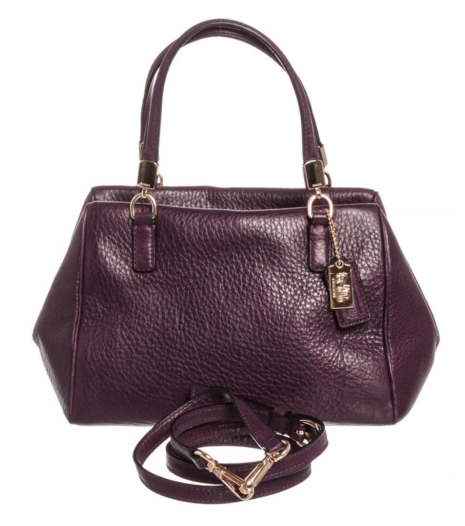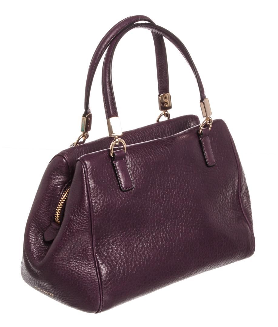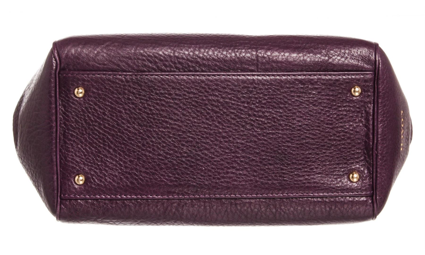 Crafted out of purple pebbled leather, zip top closure, and dual flat handles. Inner navy blue satin lining.