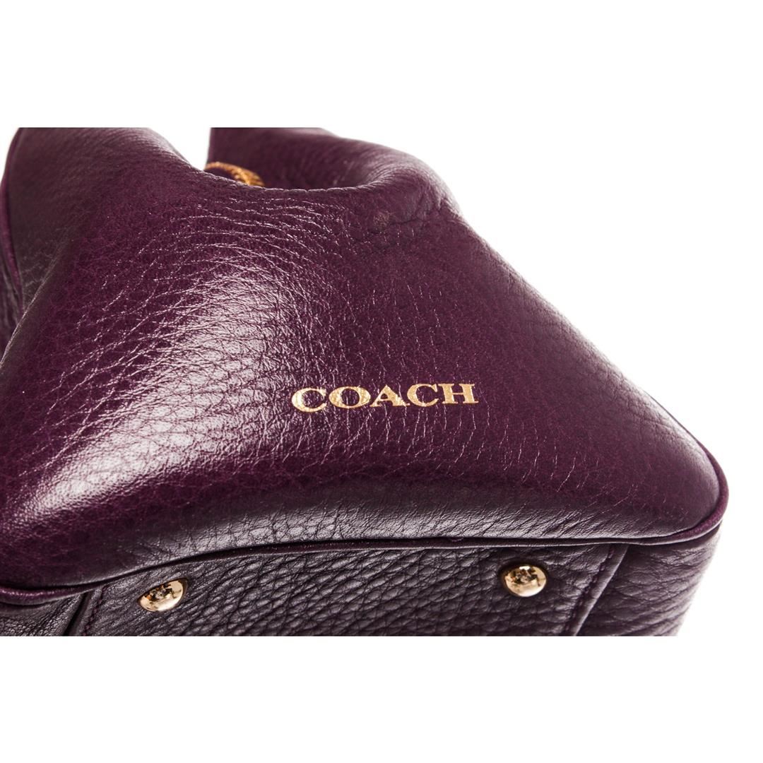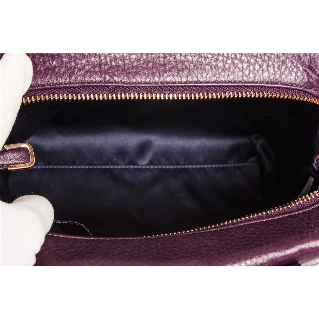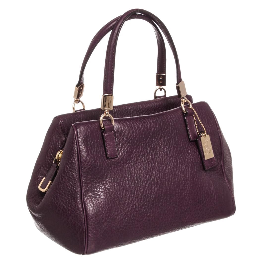 Crafted out of purple pebbled leather, zip top closure, and dual flat handles. Inner navy blue satin lining.