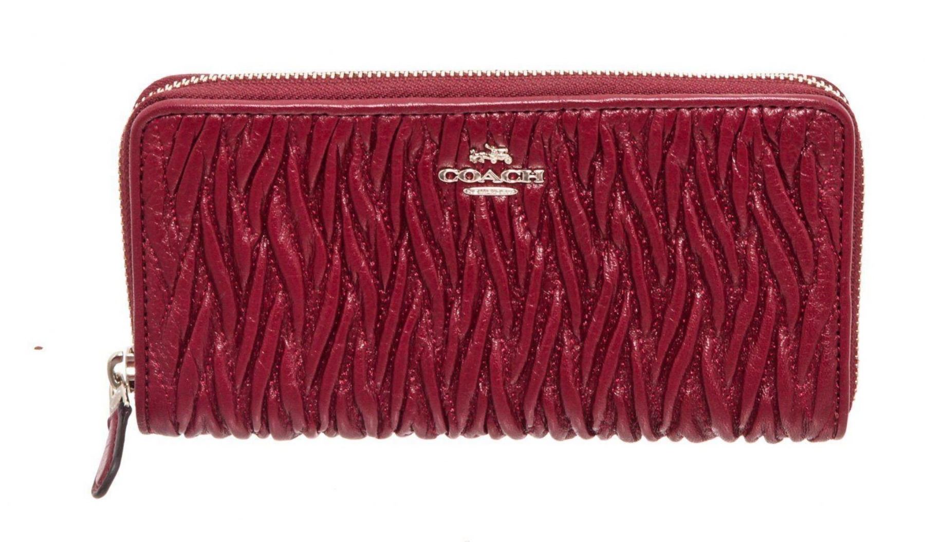 Coach red textured leather zippy wallet with silver-tone hardware, logo placard at front, five interior compartments; one with zip closure, twelve cardholder slots and overall zip around closure. Measurements: Length: 8.25 in / 21 cm Width: 1 in / 3 cm 4.5 in / 11 cmCONDITION: Pre-Owned Good overall, please see photographs for detail.