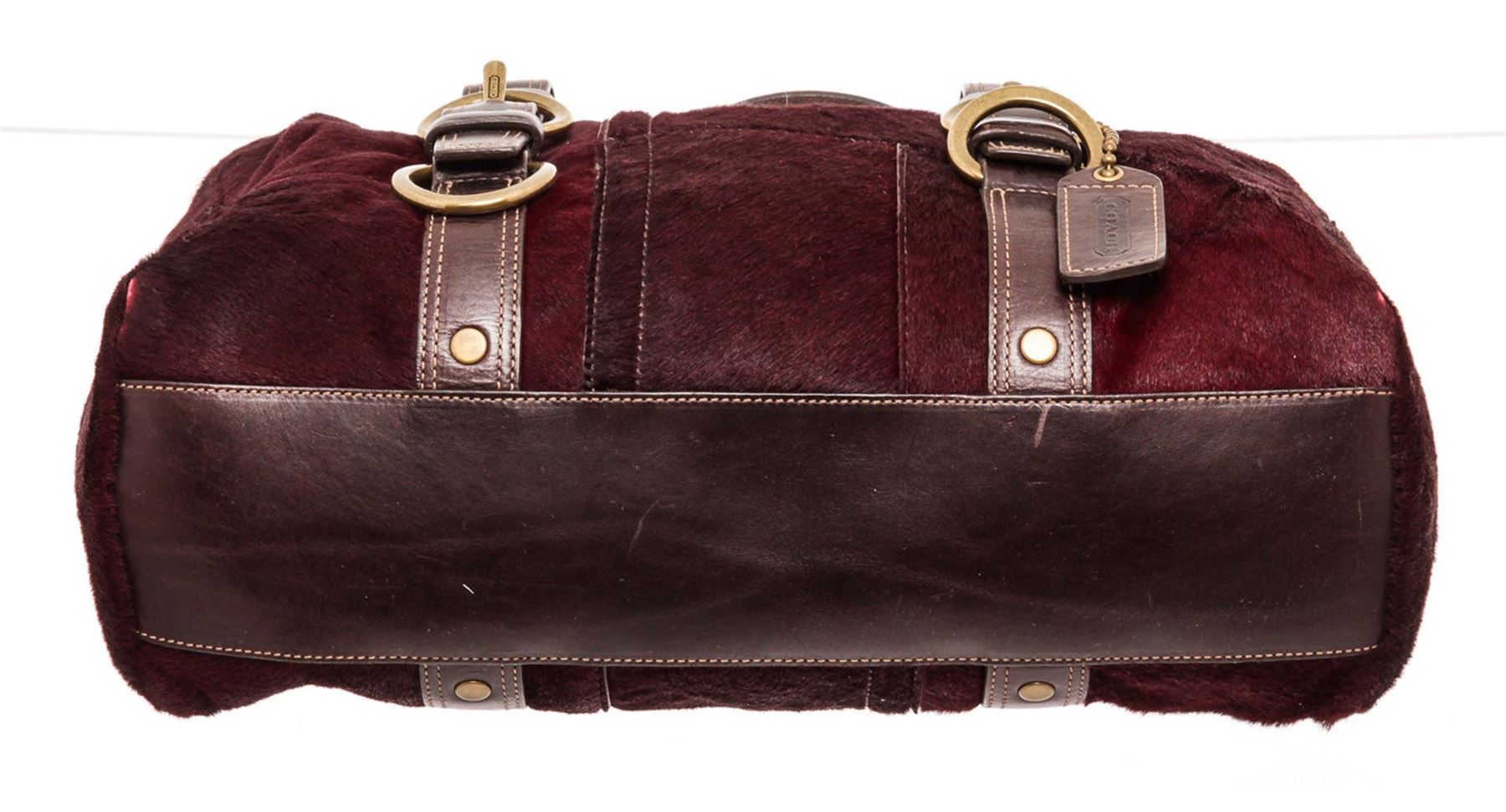 Coach Red Limited Edition Pony Hair Turnlock Satchel. Please see photos and description for all available information! Coach red limited edition pony hair turnlock satchel with gold-tone hardware, dual flat top handles, brown leather trim, red silk interi