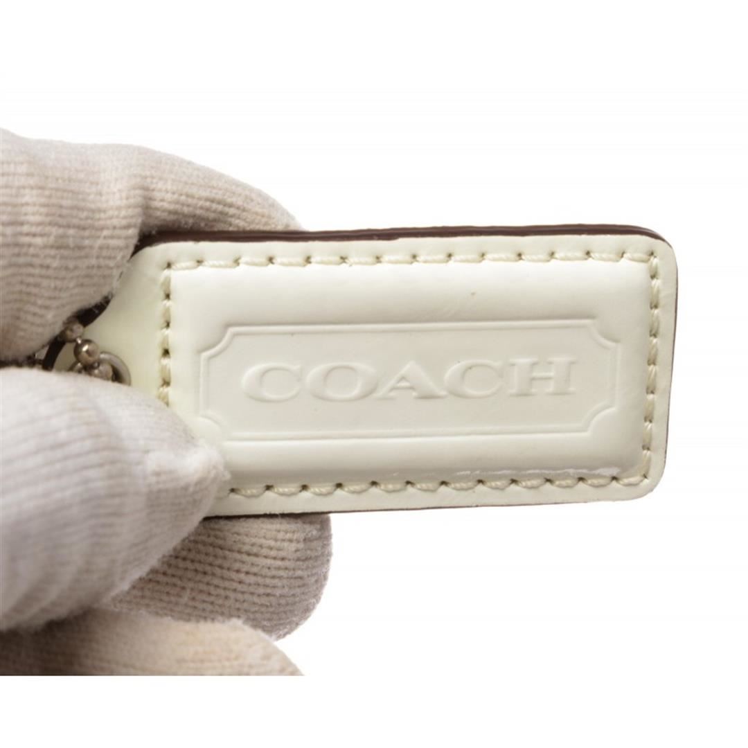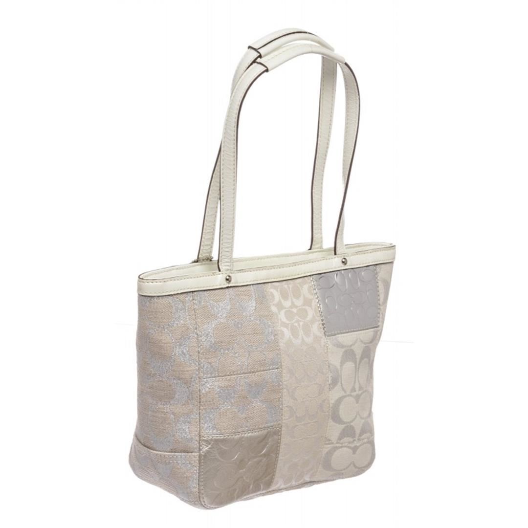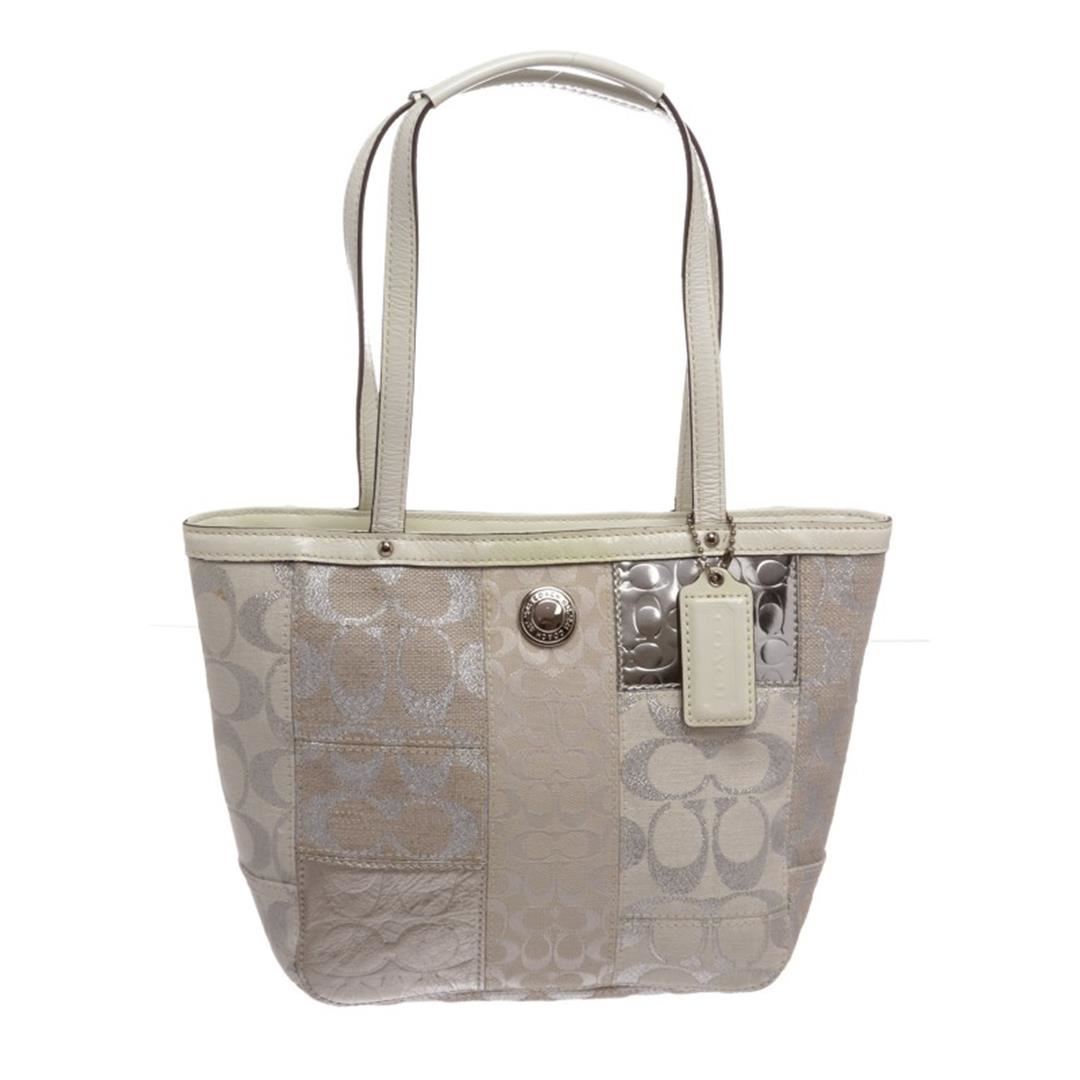 One Coach Silver White Canvas Monogram Mini Tote Bag. Overall zipper closure. Interior is satin lined with oneip pocket. Dual white flat leather handles. Item is pre-owned.