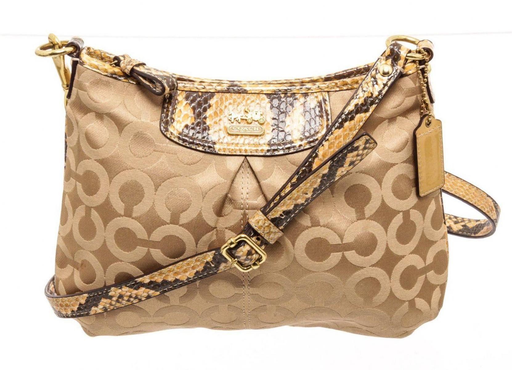 Coach tan canvas small crossbody bag with gold-tone hardware, snakeskin printed leather trim, single flat shoulder strap, logo placard at front, purple canvas interior lining, one interior pocket and overall zip closure at top. Measurements: Length: 10.6 in / 27 cm Width: 1.5 in / 4 cm 7.35 in / 19 cmCONDITION: Pre-Owned Good overall, please see photographs for detail.