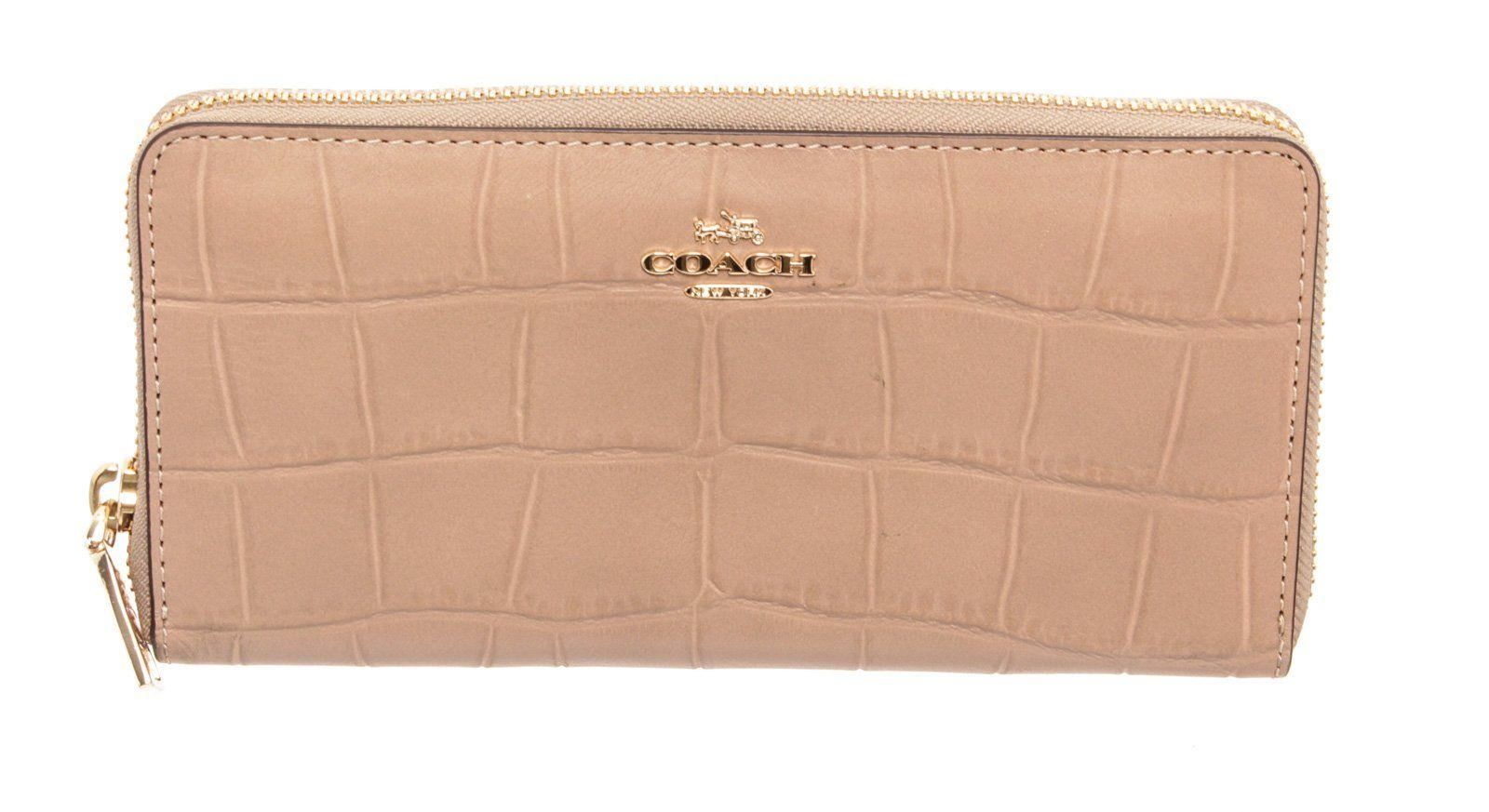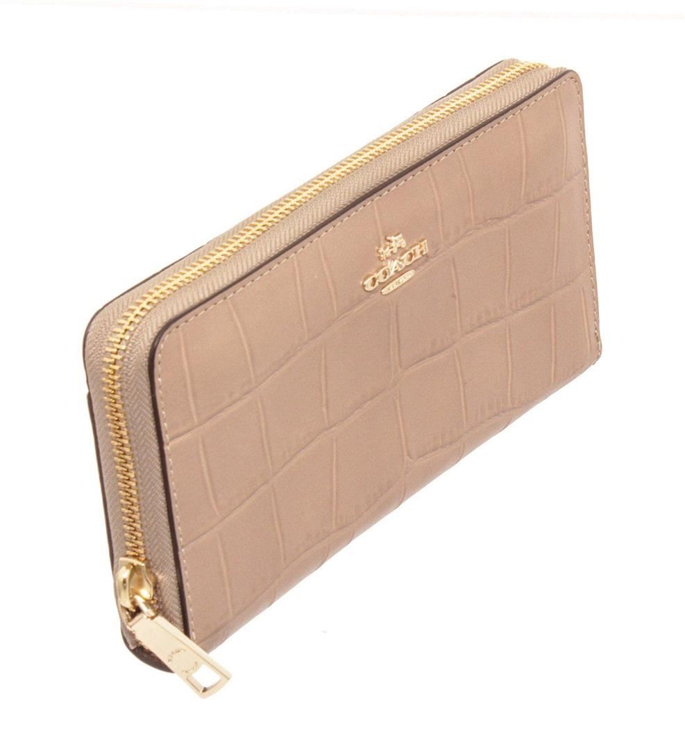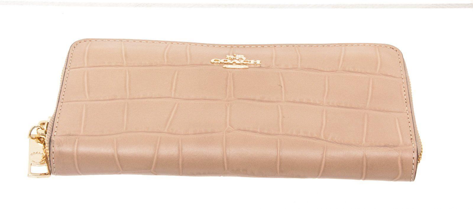 Coach tan crocodile embossed leather zippy wallet with gold-tone hardware, logo placard at front, single slip pocket at back, six interior compartments; one with zip closure, twelve cardholder slots and overall zip around closure. Measurements: Length: 8.2 in / 21 cm Width: 4.4 in / 11 cm 0.75 in / 2 cm Condition: Pre-Owned Good overall, please see photographs for detail.