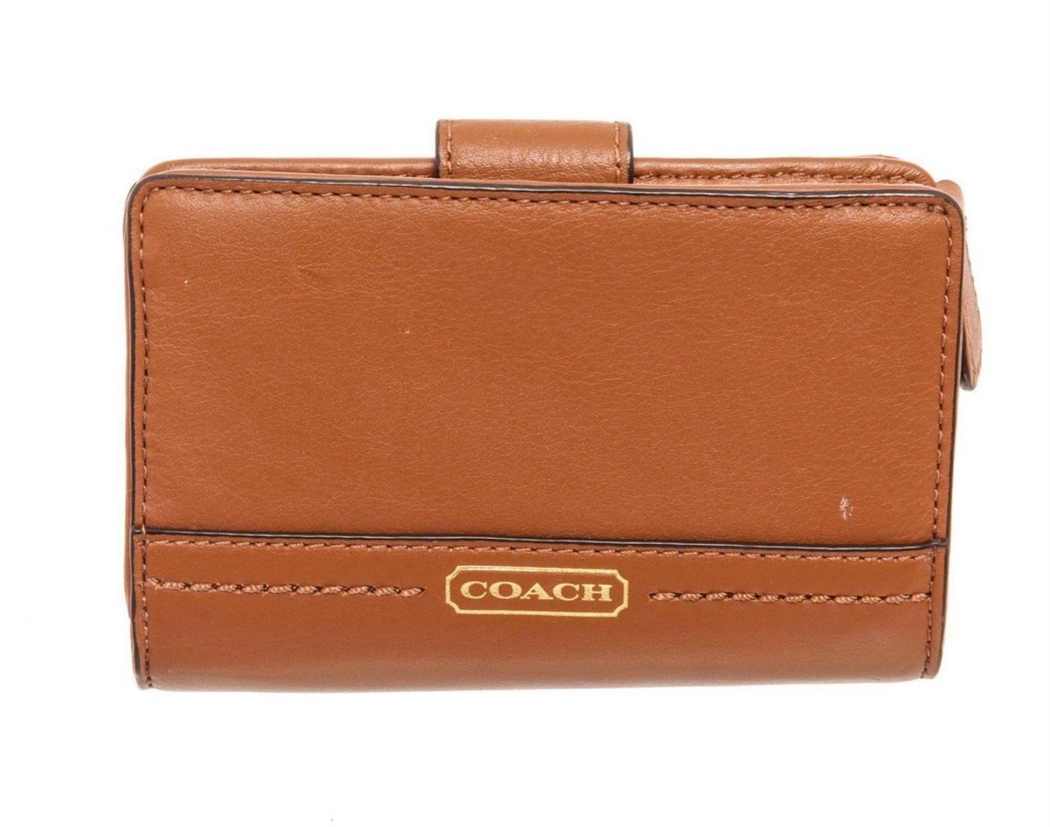Coach tan crossgrain leather tab wallet with gold-tone hardware, embossed logo at front, bill compartment at top, five interior compartments; one with zip closure, seven cardholder slots; one with ID slot and overall snap closure at tab. Measurements: Length: 5.3 in / 13 cm Width: 1 in / 3 cm 3.65 in / 9 cmCONDITION: Pre-Owned Good overall, please see photographs for detail.