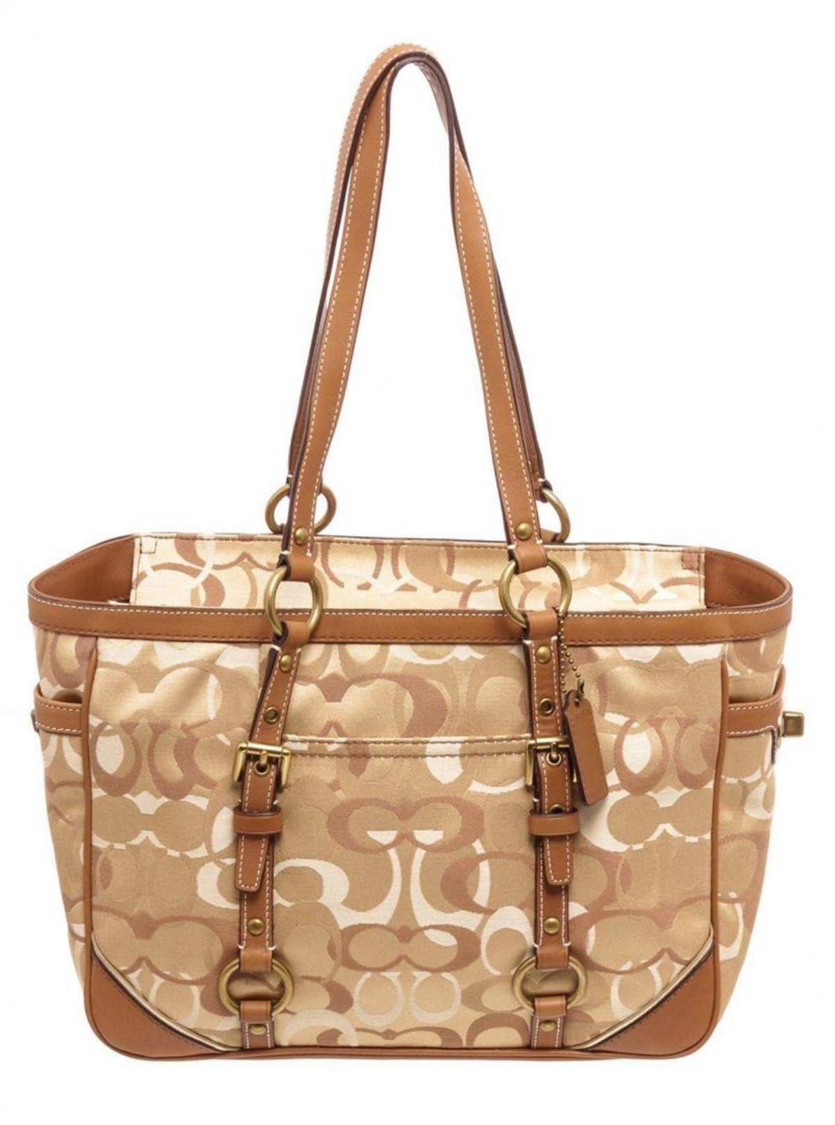 Coach tan Op Art canvas shoulder bag with gold-tone hardware, dual flat top handles, single slip pocket at front, brown leather trim, beige canvas interior lining, three interior pockets; one with zip closure and overall zip closure at top. Measurements: Length: 14.3 in / 36 cm Width: 4.25 in / 11 cm 11 in / 28 cmCONDITION: Pre-Owned Good overall, please see photographs for detail.