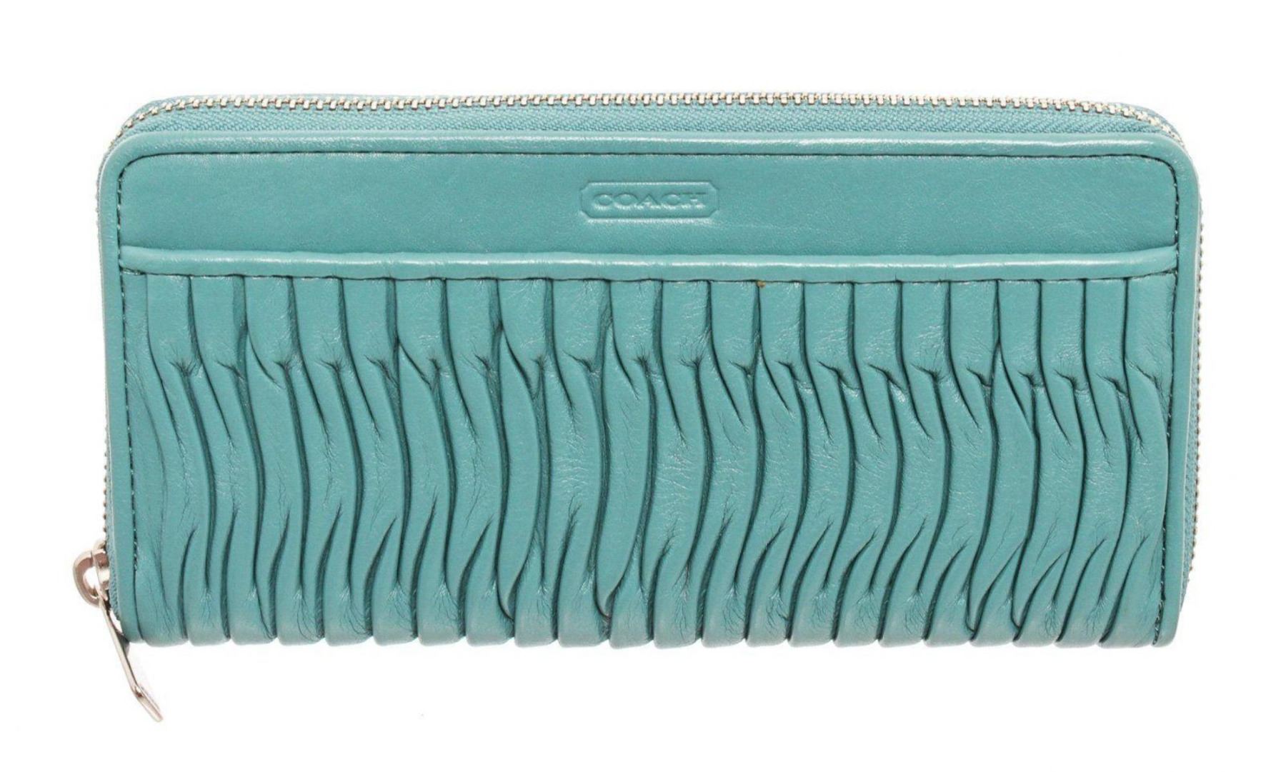 Coach gathered leather Taylor zippy wallet with silver-tone hardware, embossed logo at front, single slip pocket at front, six interior compartments; one with zip closure, twelve cardholder slots and overall zip around closure. Measurements: Length: 8.65 in / 22 cm Width: 1 in / 3 cm 4.6 in / 12 cmCONDITION: Pre-Owned Good overall, please see photographs for detail.