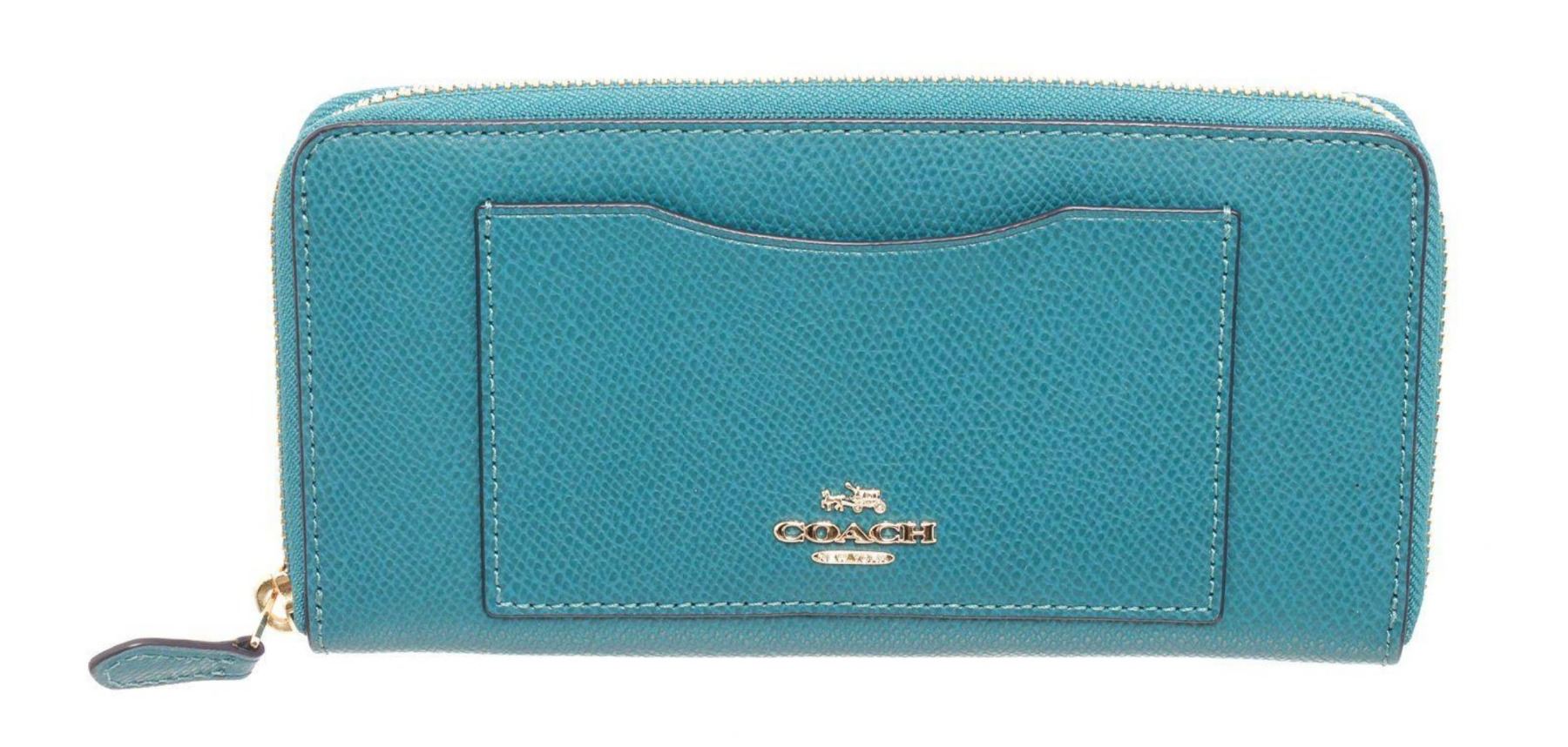 Coach turquoise blue leather long zippy wallet with gold-tone hardware, logo placard at front, single slip pocket at front face, five interior compartments; one with zip closure, twelve cardholder slots and overall zip around closure. Measurements: Length: 8.25 in / 21 cm Width: 1 in / 3 cm 4.3 in / 11 cmCONDITION: Pre-Owned Good overall, please see photographs for detail.