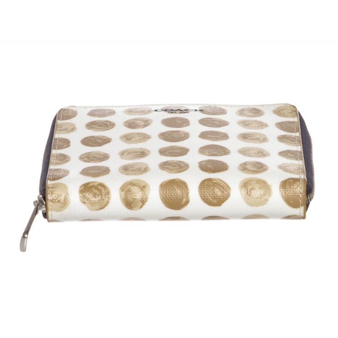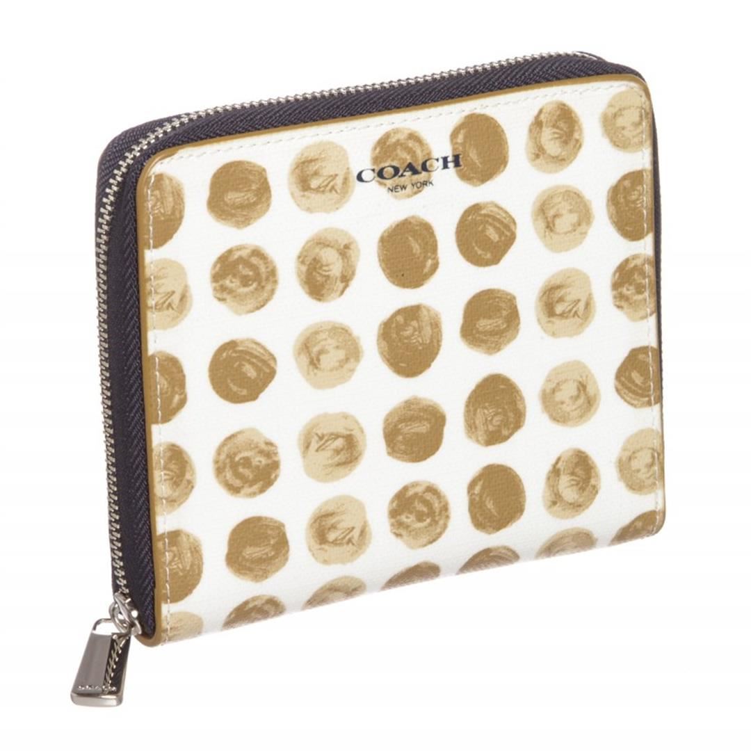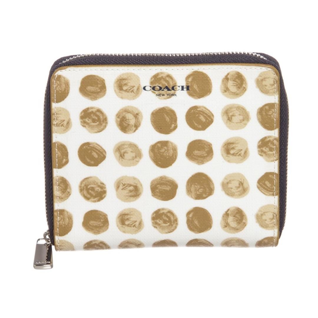 White beige Coach canvas leather Polka Dot zipper wallet with beige canvas leather lining, eight card pockets, one coin compartment with snap button closure, two side slip pockets and one bill compartment. Comes with Dustbag. Item is pre-owned.