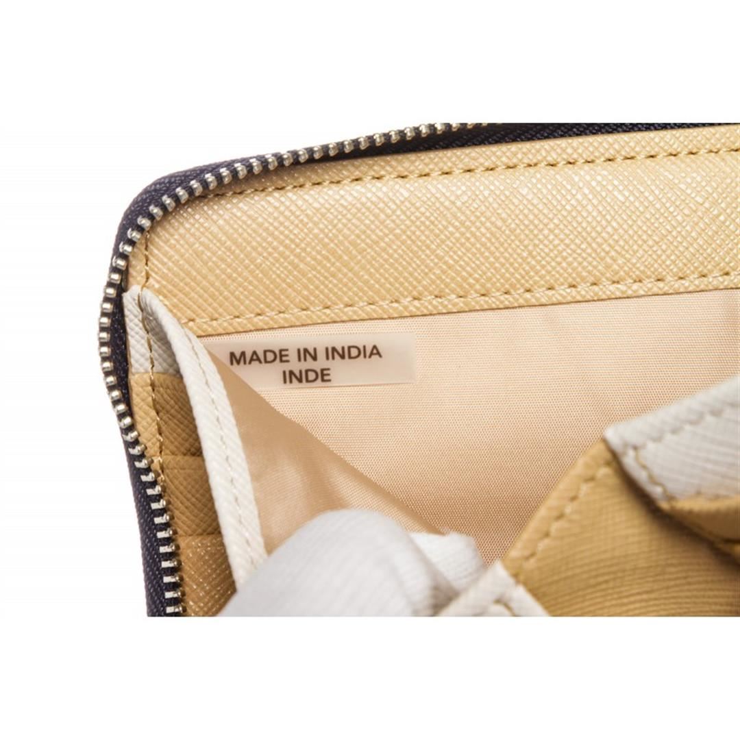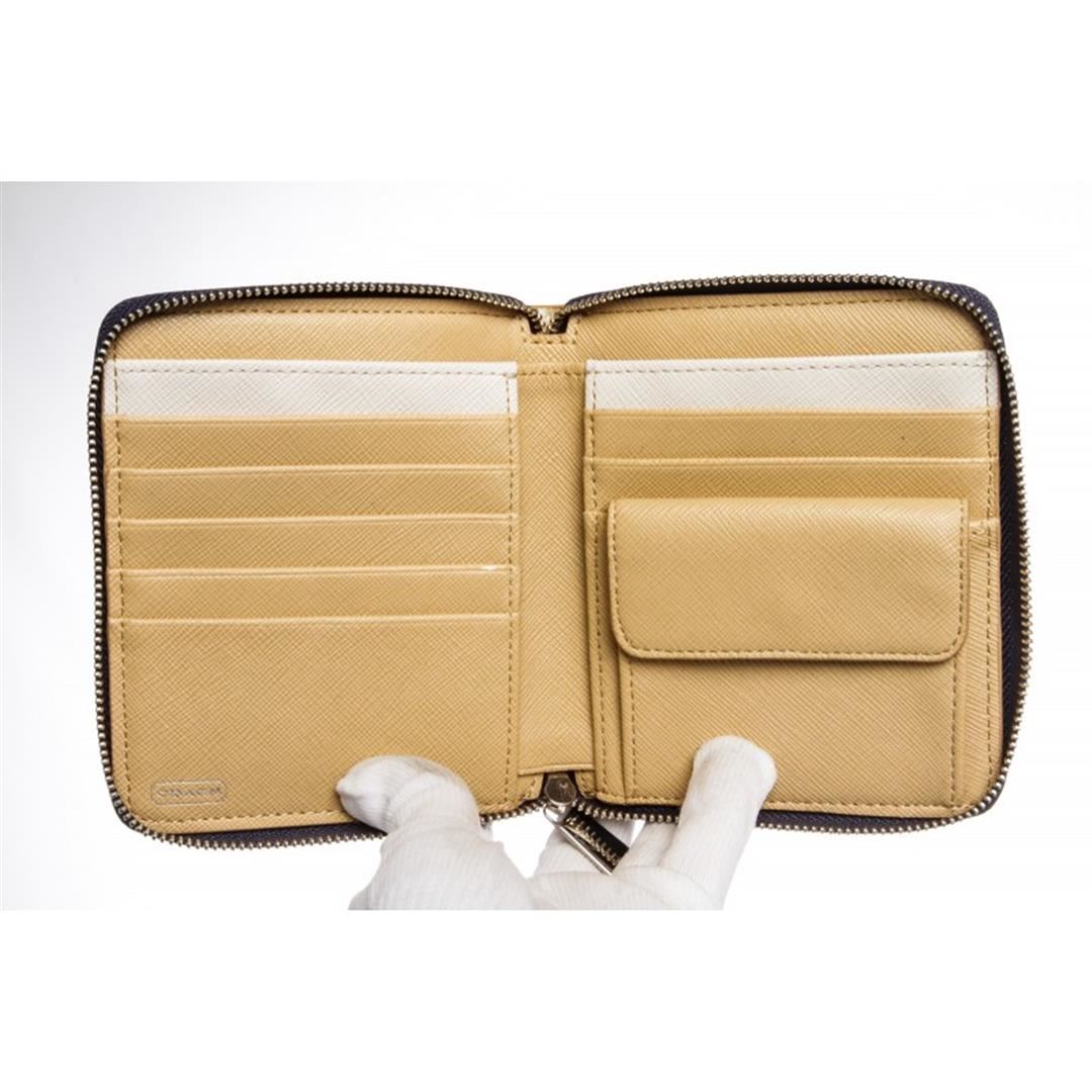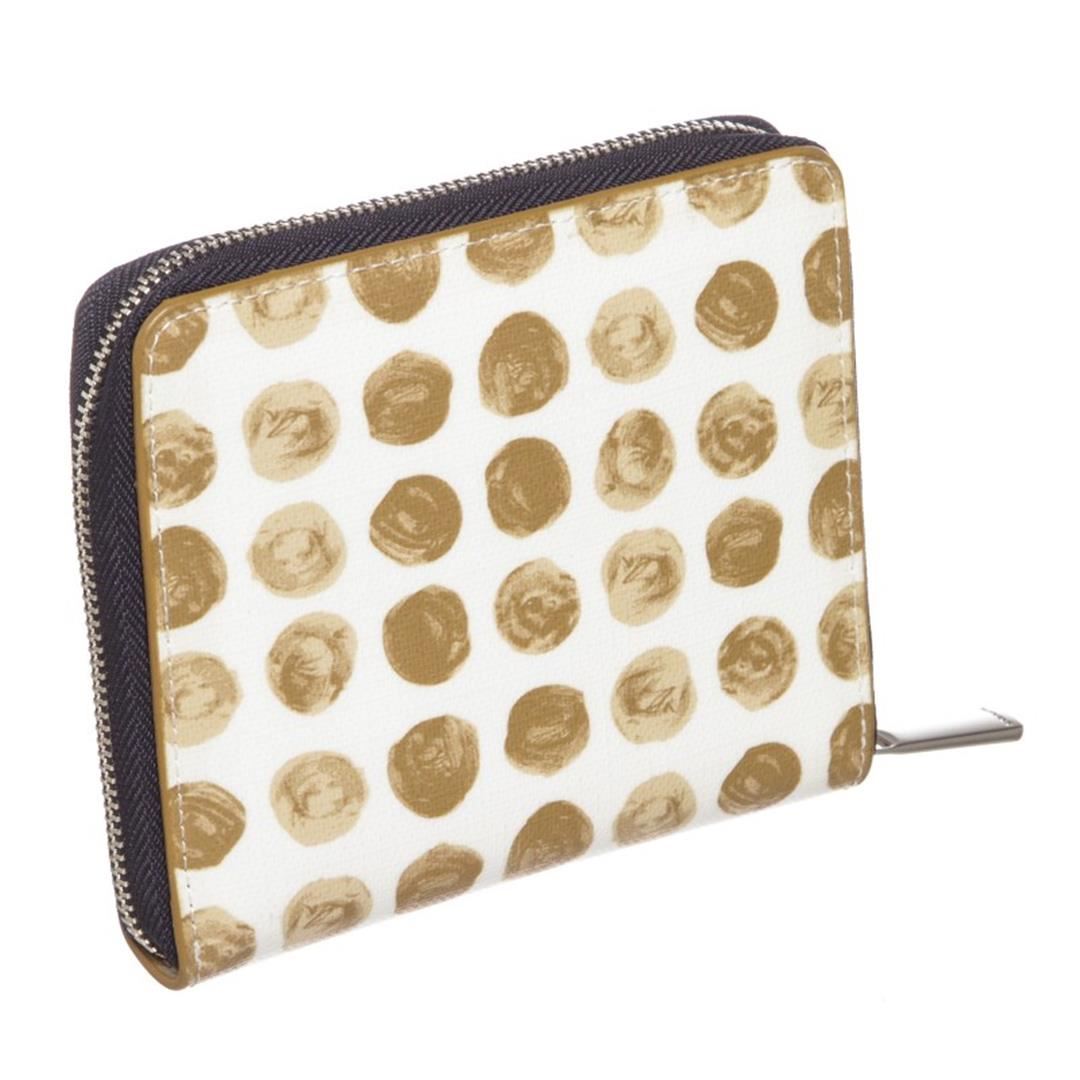 White beige Coach canvas leather Polka Dot zipper wallet with beige canvas leather lining, eight card pockets, one coin compartment with snap button closure, two side slip pockets and one bill compartment. Comes with Dustbag. Item is pre-owned.