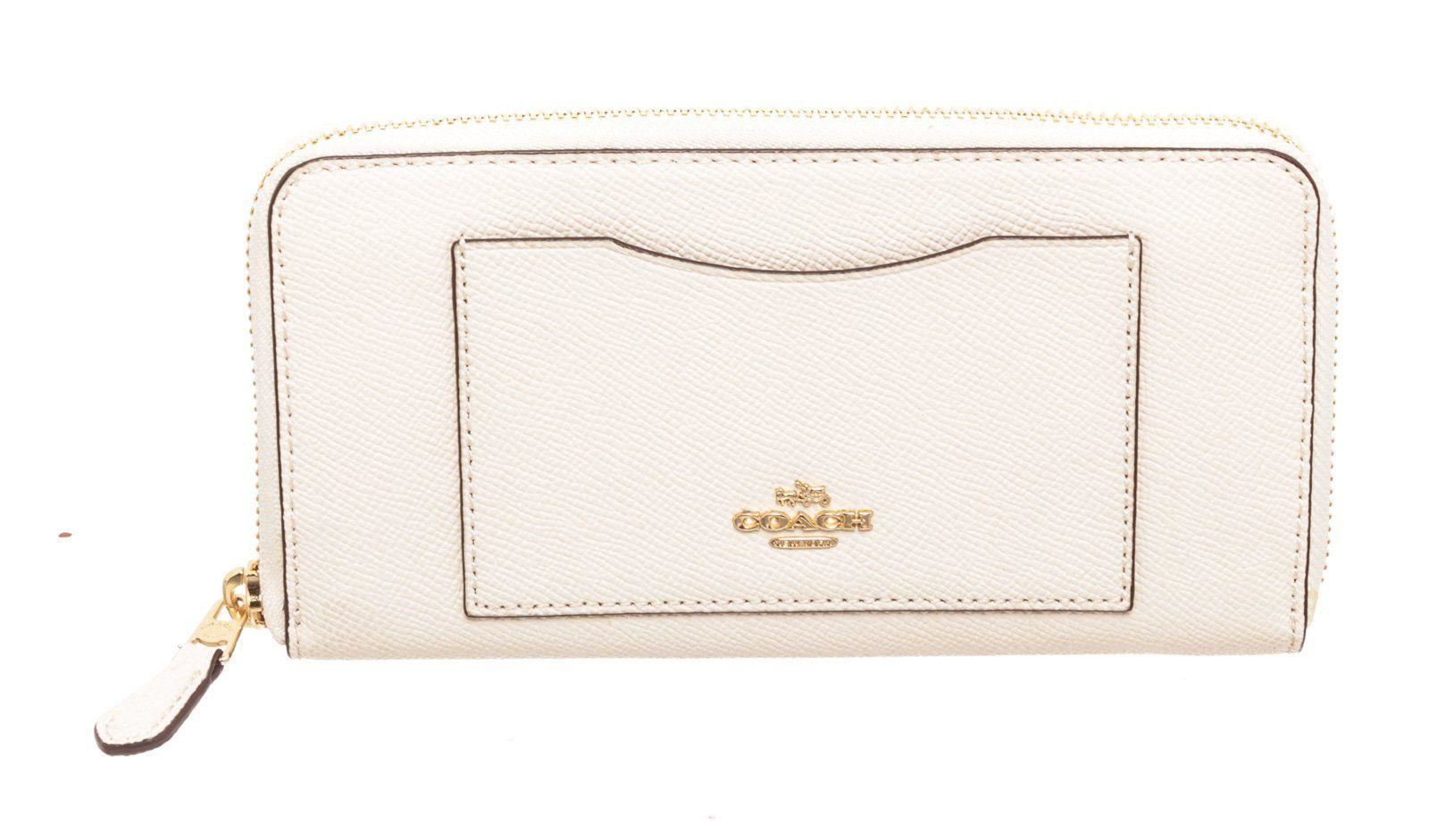 Coach white crossgrain leather zippy wallet with gold-tone hardware, single slip pocket and logo placard at front, white leather interior lining, five interior compartments; one with zip closure and overall zip around closure. Measurements: Length: 8.35 in / 21 cm Width: 0.75 in / 2 cm 4.4 in / 11 cmCONDITION: Pre-Owned Good overall, please see photographs for detail.