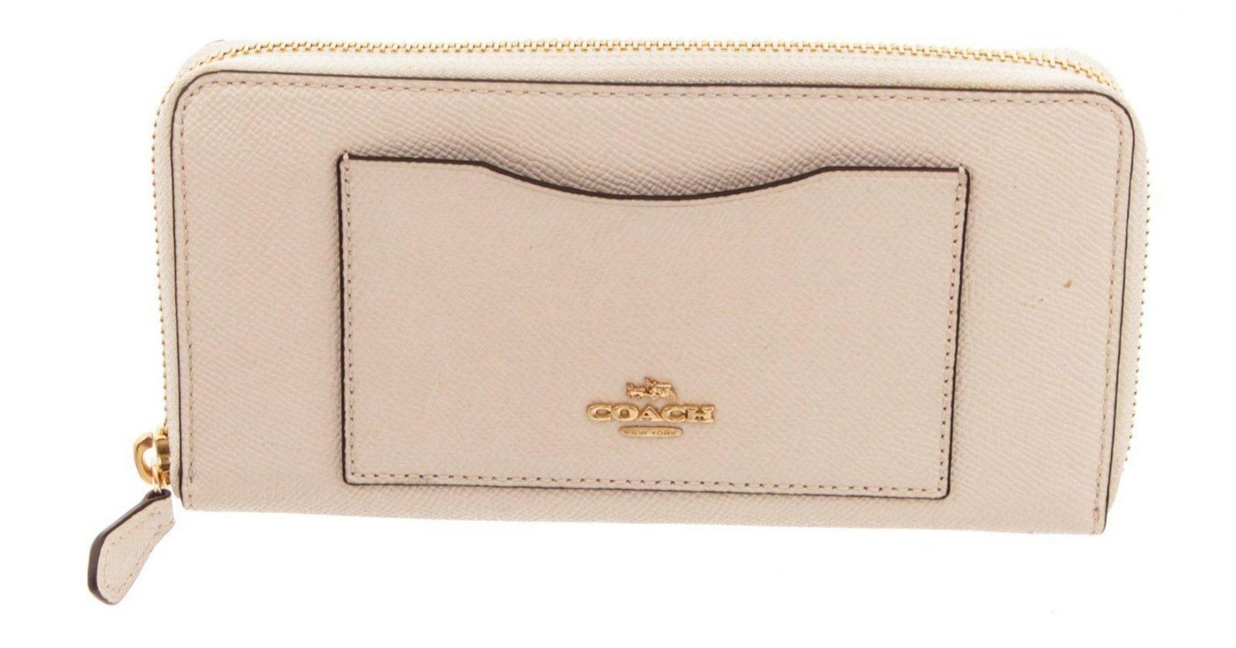 Coach white leather long zippy wallet with gold-tone hardware, logo placard at front, single slip pocket at front face, five interior compartments; one with zip closure, twelve cardholder slots and overall zip around closure. Measurements: Length: 8.25 in / 21 cm Width: 1 in / 3 cm 4.3 in / 11 cmCONDITION: Pre-Owned Good overall, please see photographs for detail.