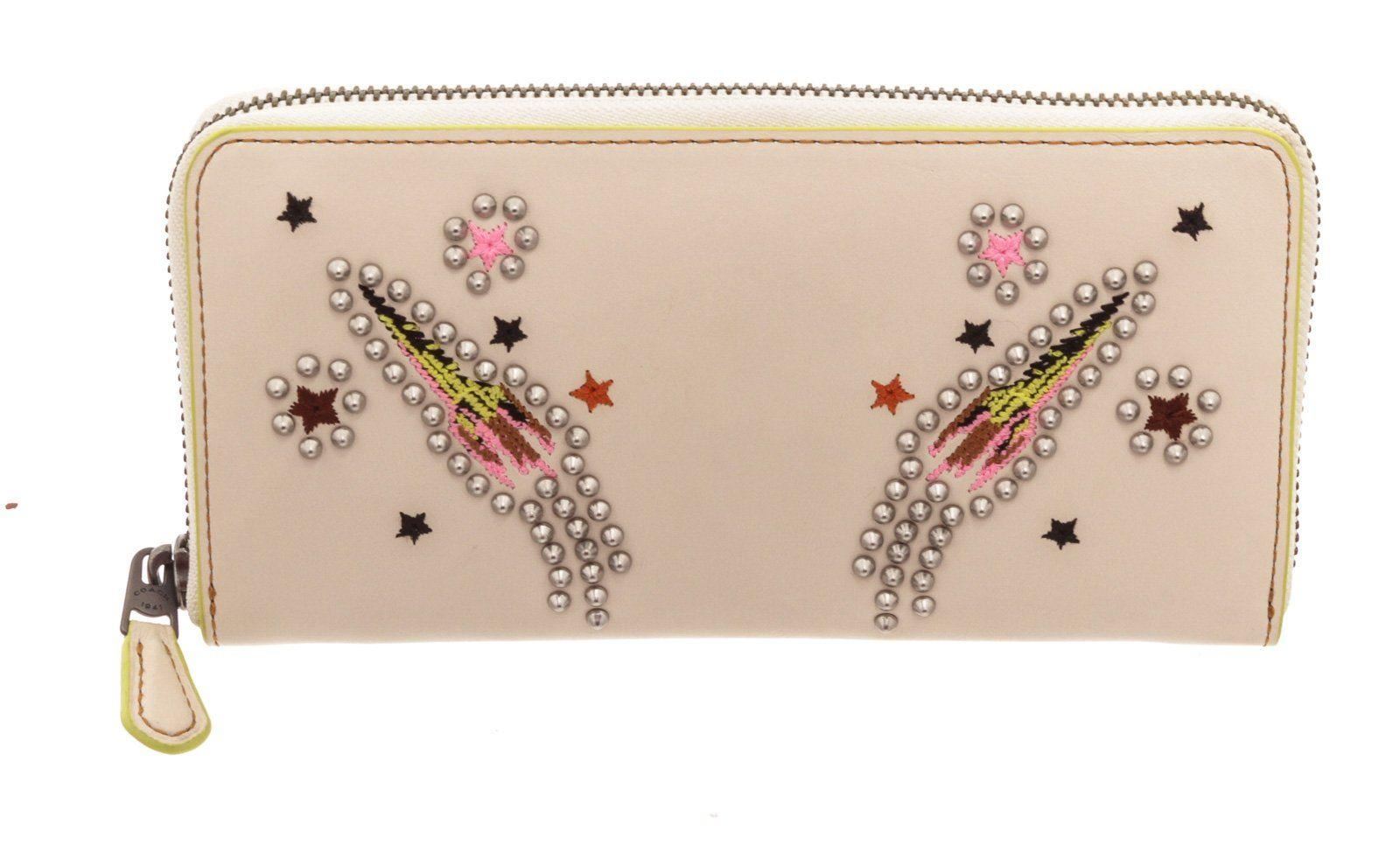 Coach white leather Rocket Accordian zippy wallet with silver-tone hardware, rocket embelshments at front face, lime green leather trim, black leather interior lining, five interior compartments; one with zip closure, twelve cardholder slots and overall zip around closure. Measurements: Length: 8 in / 20 cm Width: 0.85 in / 2 cm 4.35 in / 11 cmCONDITION: Pre-Owned Good overall, please see photographs for detail.