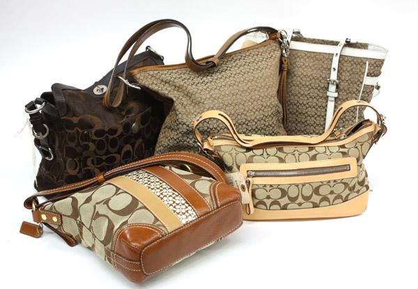(lot of 5) Coach designer brown canvas monogram shoulder bags in various sizes