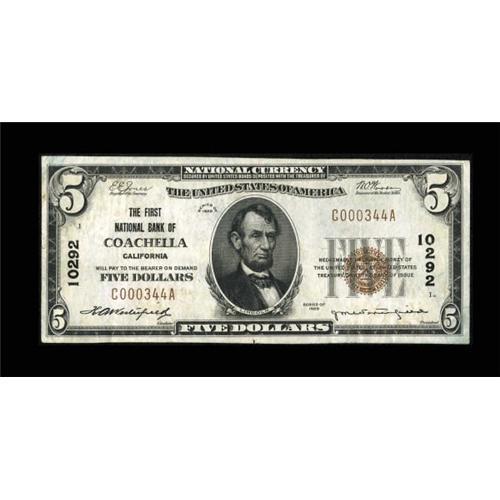 <B>Coachella, CA</B></I> - $5 1929 Ty. 1 <B>The First NB</B></I> Ch. # 10292<BR> While most of the notes in the Kansas City collection were large size, there were a substantial number of Series 1929 examples as well, including a fair number of rarities such as this note, which comes from a bank with just one large and three small notes reported to date. This piece is considerably nicer than the example we sold as part of the Horwedel collection, which realized $8337.50 over three years ago. The note is signed by H.A. Westerfield and J.M Westerfield, members of a prominent Inland Empire banking family which also signed as officers on the Banning large note offered above. <B>Very Fine.</B></I><BR><I>From The Kansas City Collection.</B></I><BR><BR><b>Shipping:</b> Coins & Currency (<a target="_blank" href="http://www.heritageauctions.com/common/shipping.php">view shipping information</a>)
