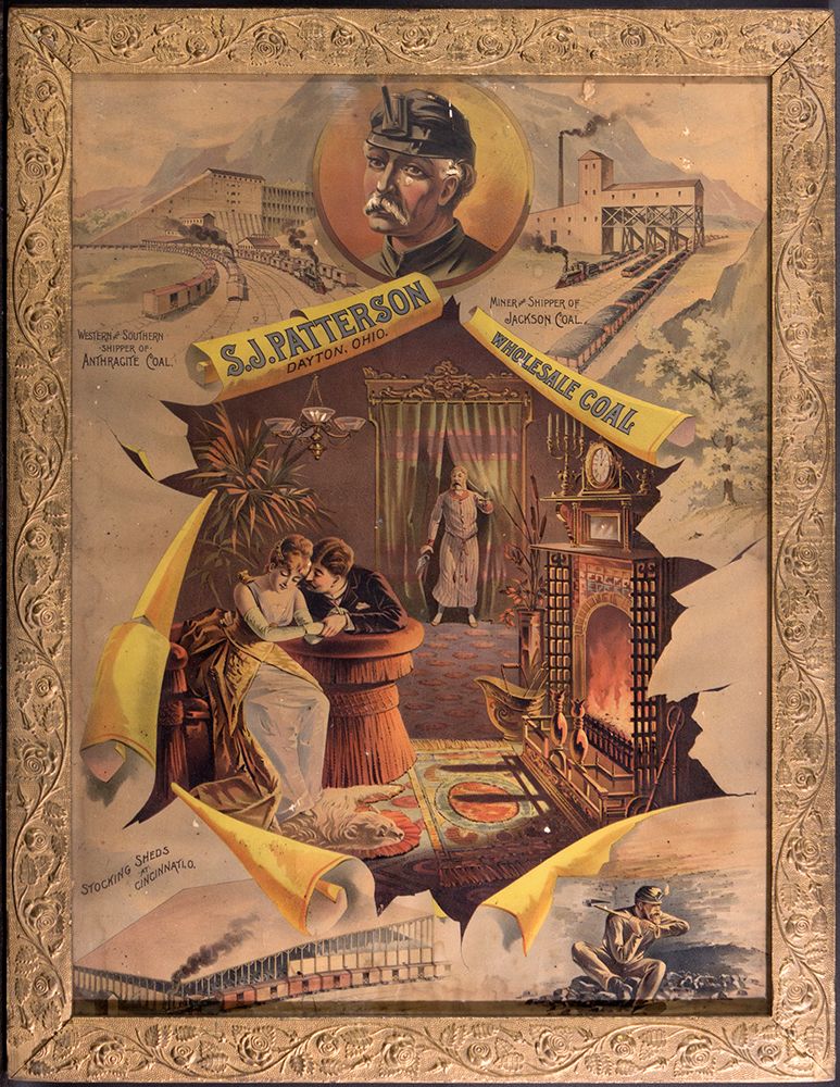 c1887 A framed and mounted 22" x 29" advertisement for S.J Patterson Wholesale Coal. A copy of this particular piece is filed in the Library Of Congress. It humorously depicts a father discovering his daughter and suitor necking in the parlor by candlelight. Other illustrations show a miner in a hard hat, lines of coal loaded rail cars lined up on a factory siding and the declarations, "Stocking Sheds at Cincinnati, O., Miner and Shipper of Jackson Coal and Western and Southern Shipper of Anthracite Coal. The frame is gilded and very fancy, the print is in very good condition. It`s a great example of 19th Century advertising art. - HKA#66335