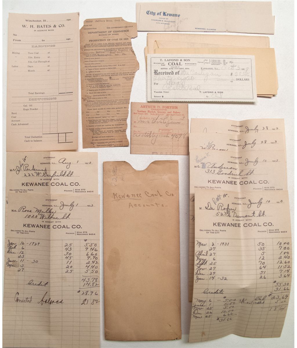 1) W. H. Bates unused 190- billhead. 2) T. Lafond & Son coal merchants 1919 receipt. 3) Kewanee Coal Co. of Illinois group of Fourteen letters, four billheads, and a city of Kewanee billhead. 5) Badly torn Jeffers Coal Co. production of coal.