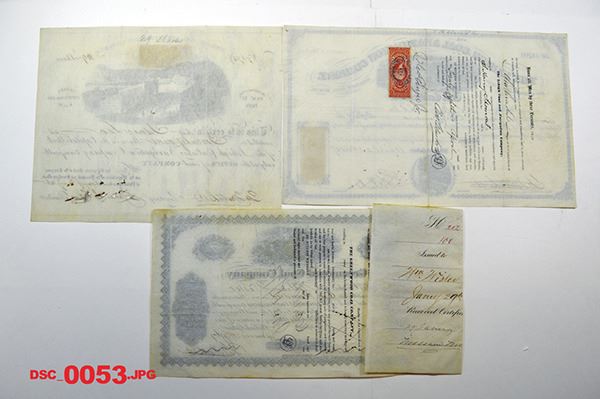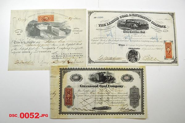 Pennsylvania, Lot of 3 stocks, Includes Greenwood Coal Co., 1869; Lehigh Coal & Navigation Co., 1865 and 1869 certificates. Fine to VF. 2 printed by ABNC.