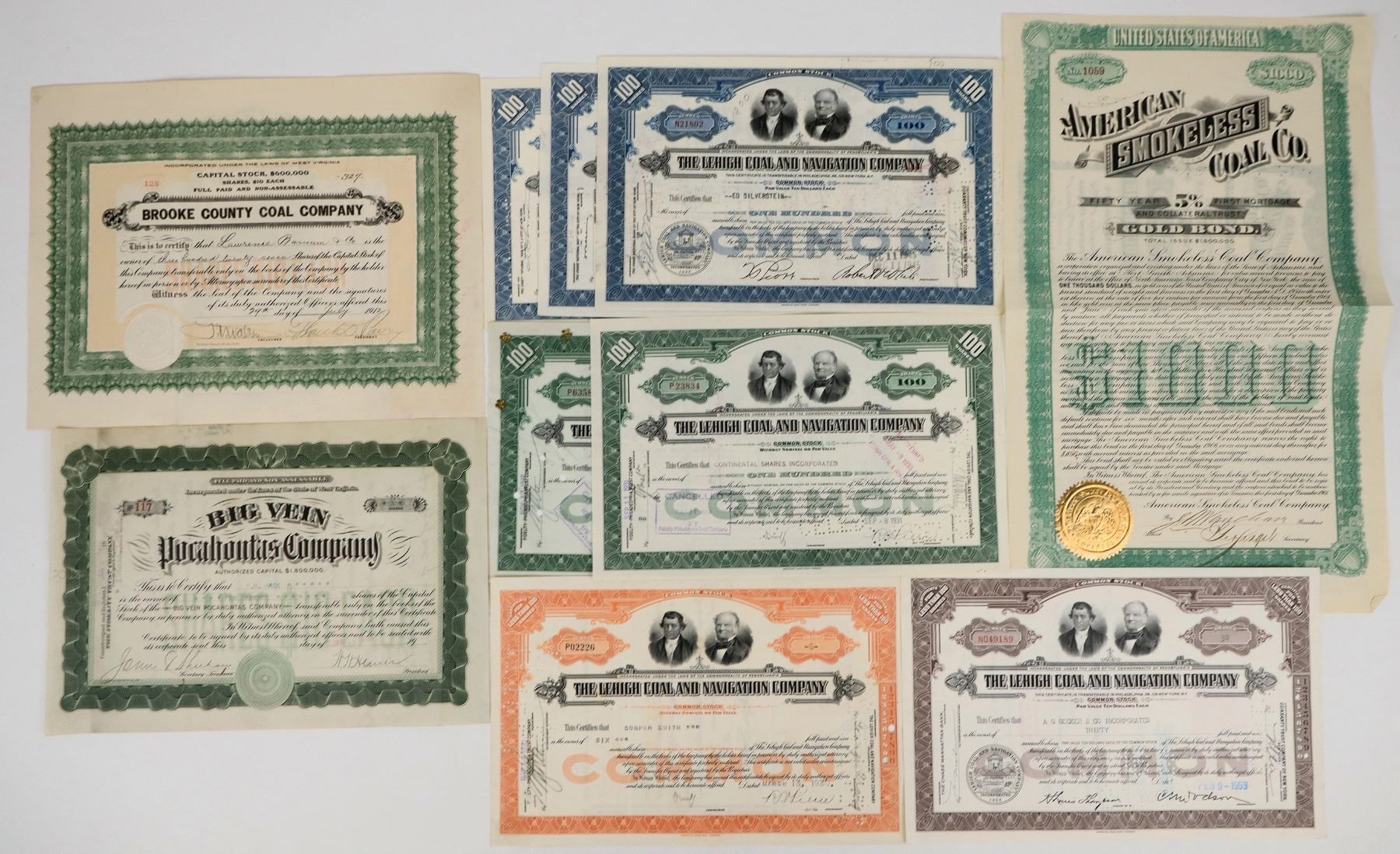Coal mining stock certificates: Brooke County Coal Company (1912, revenue stamps); Lehigh Coal and Navigation Company (7) (1930-1950); Big Vein Pocahontas Company; American Smokeless Coal Co.