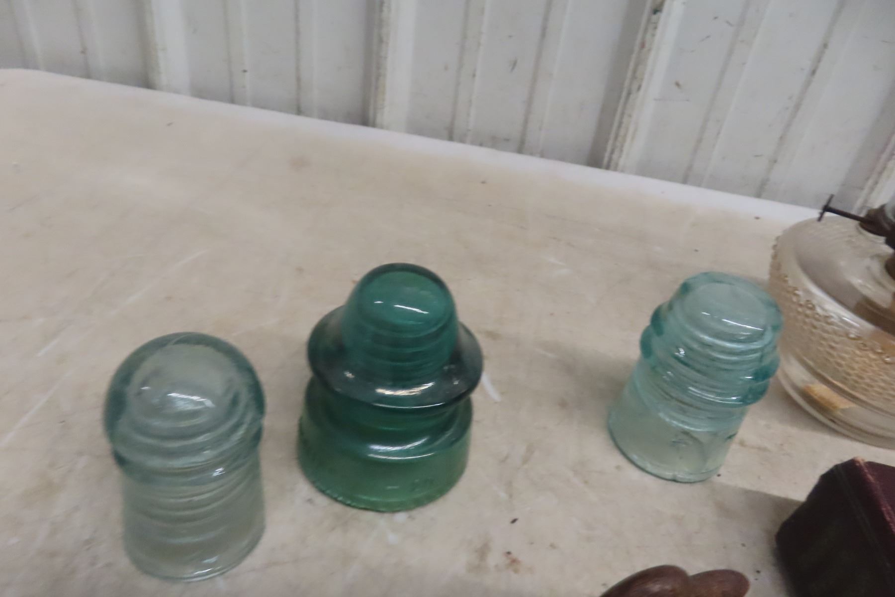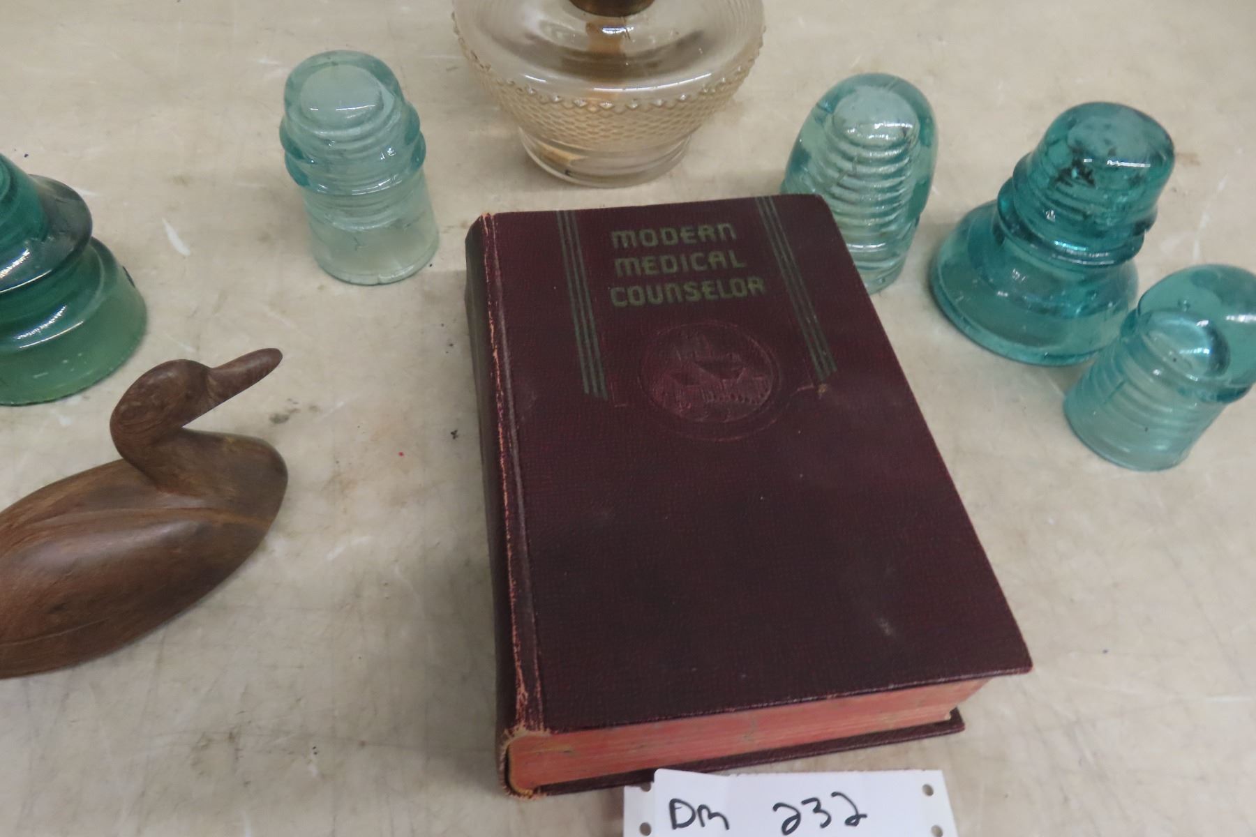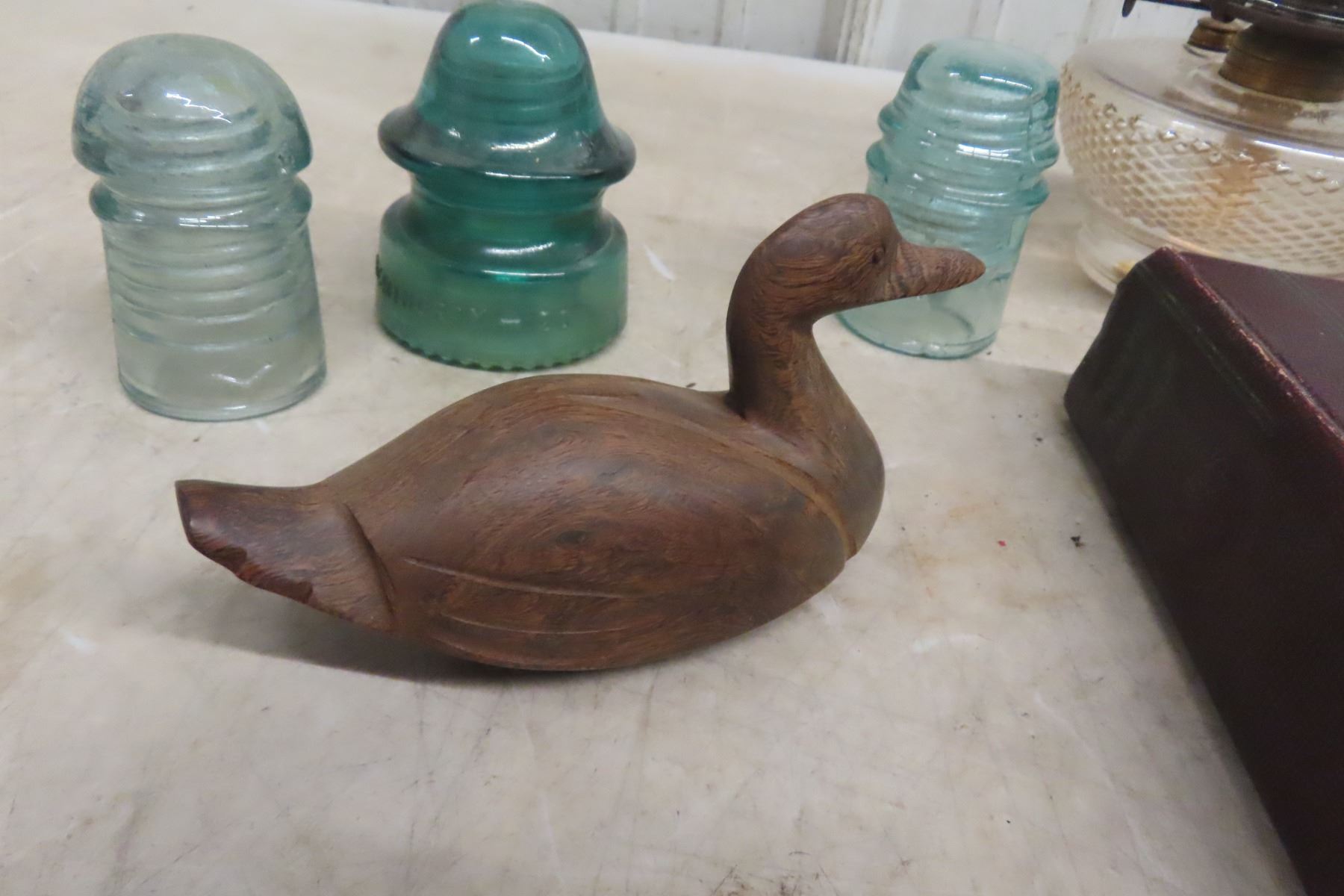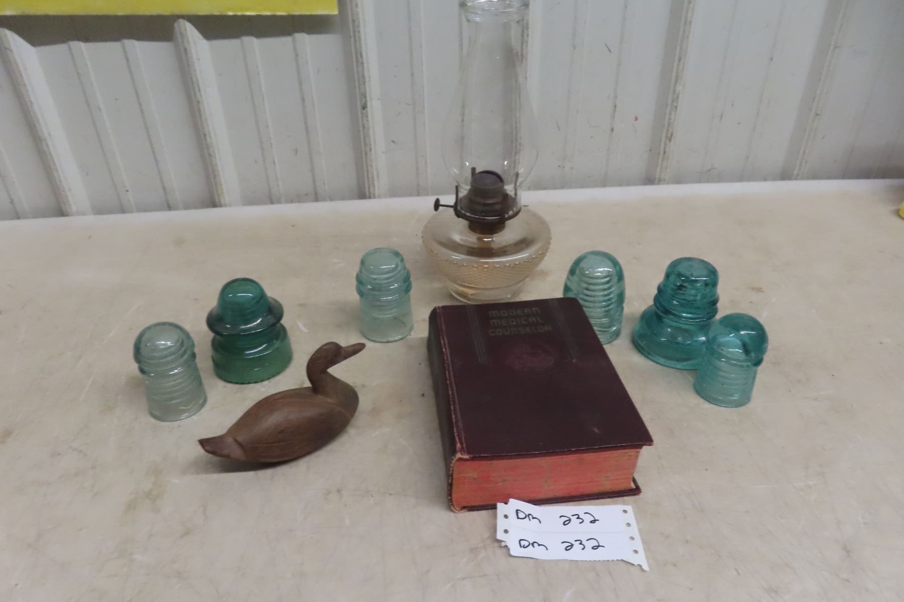 Coal Oil Lamp, Insulator, Medical Book, and Wood-Carved Duck