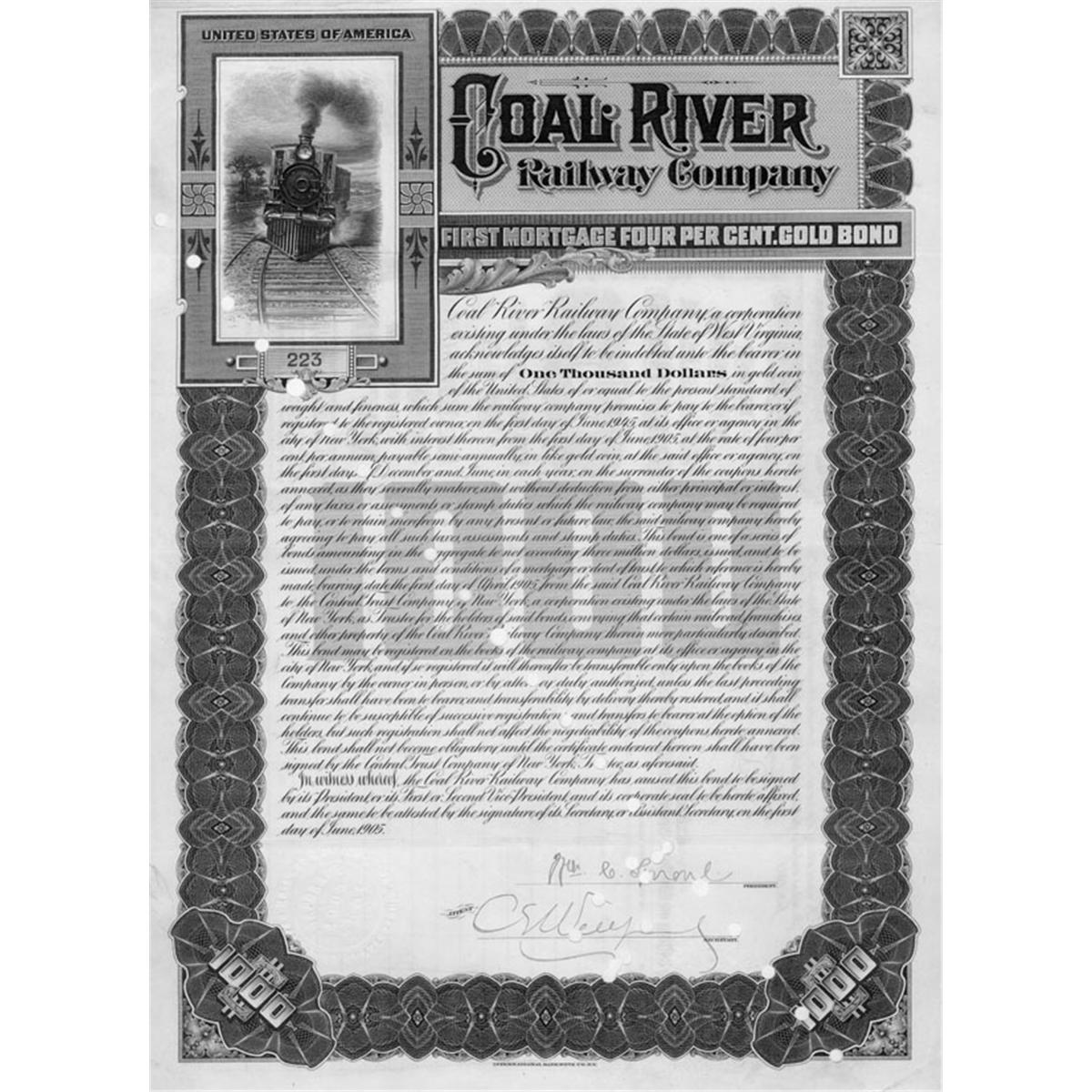 1905, New York. $1000 bond bearing 4% interest. Black. Vignette of train at top left. Punch cancelled and very fine.