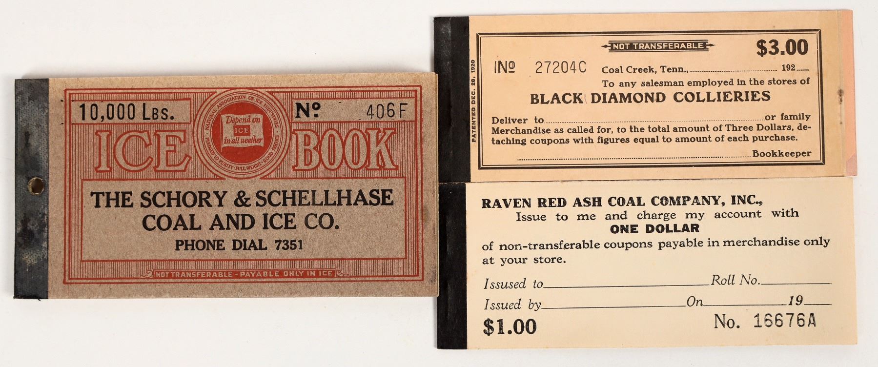Three different coupon books: 1) Raven Red Ash Coal Company, Red Ash Virginia; 2) Black Diamond Collieries, Coal Creek Tennessee; 3) The Schory & Schellhase Coal and Ice Company, Canton, Ohio.