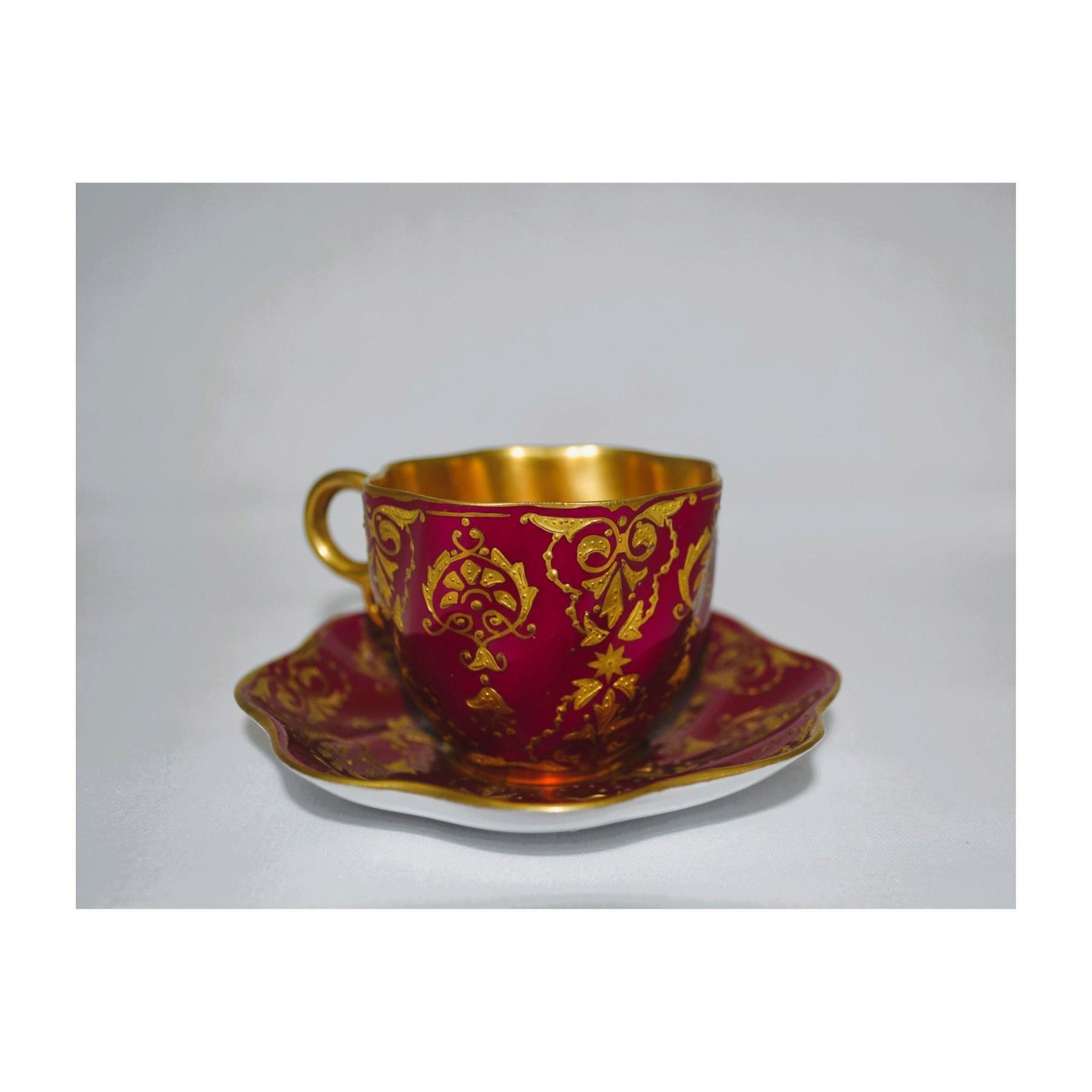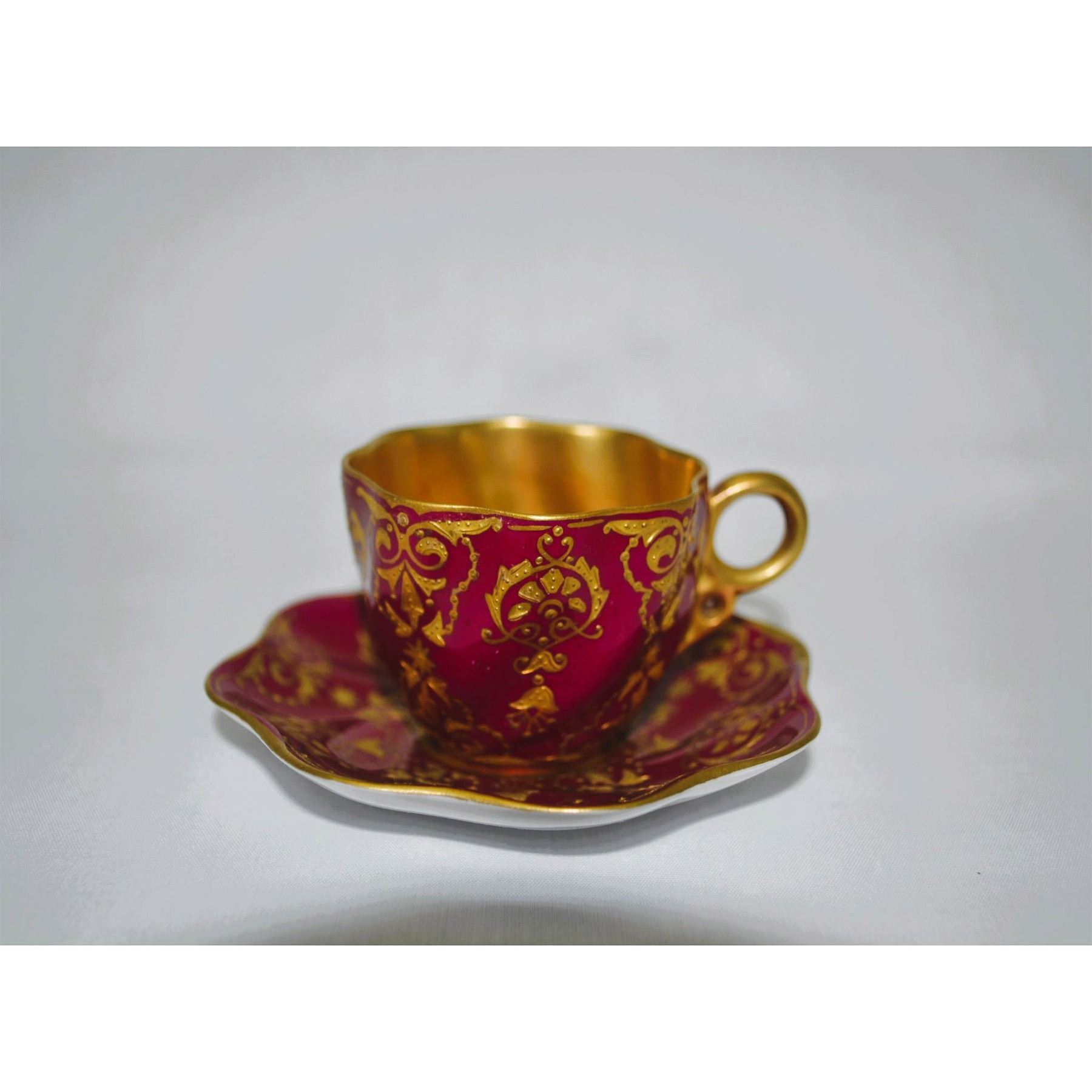 Glazed Porcelain Decorated, hand created and hand painted by CoalPort, featuring a Cup and Saucer with a Burgundy Ground, an Applied Gold Pattern and a Gold applied interior. Authentic CoalPort Backstamps on the underside of the Cup and Saucer. See Photos for further details. Size: Cup: 1.5"H x 2.75"W. Saucer: 3.5"Dia. From the Archival Collection of Re Vann Galleries, G.Reasoner, Owner.