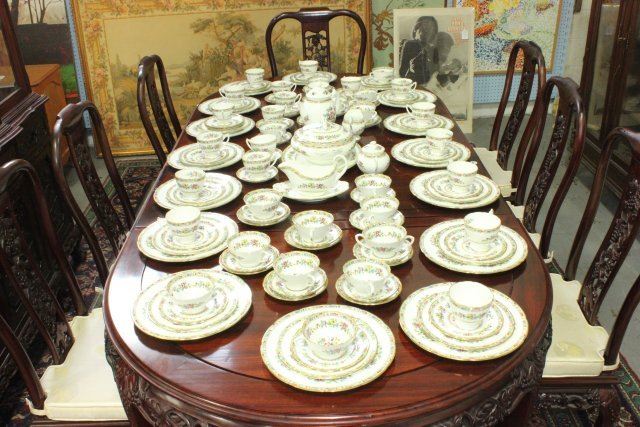"Ming Rose". Including (16) 10 3/4" dinner plates, (16) 8" luncheon plates, (16) double handle cream soups, (16) underplates for cream soups, (16) 6 1/4" dessert plates, (20) cups & saucers, (1) 14" platter, (1) double handled covered tureen, (1) coffee pot, sugar bowl, & creamer with underplate, (1) gravy boat with underplate. 122 pieces.