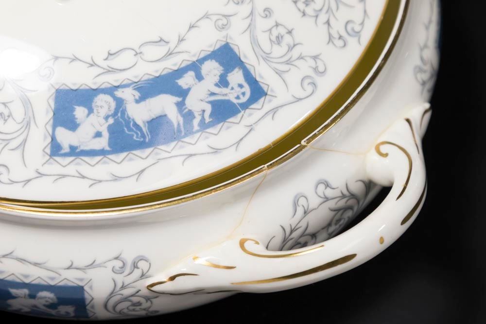 Revelry pattern. 158 pieces. Including 2 creamers, 2 sugar, 1 gravy with undertray, 1 toothpick holder, 3 oval bowls, 1 covered round casserole, 1 casserole without cover, 18 dinner plates, 5 oval trays (17" L and 13" L), 21 large cups, 18 underplates,12 cups, 18 luncheon,bowls 15 saucers