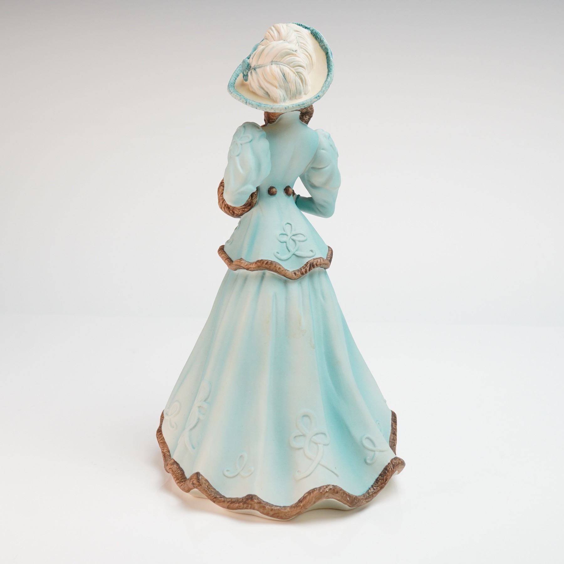 A Coalport porcelain figurine titled Elizabeth A Walk in Winter, part of The Edwardian Seasons Collection produced for Danbury Mint. The figure is modeled in Edwardian-style winter attire, featuring a light blue jacket and long skirt with textured brown fur-effect trim. The subject wears a wide-brimmed hat with ribbon details and holds a matching brown muff with a tassel. The figurine features a matte finish. The underside is marked with the Coalport manufacturer mark, the title of the piece, the collection name, and Made in England.